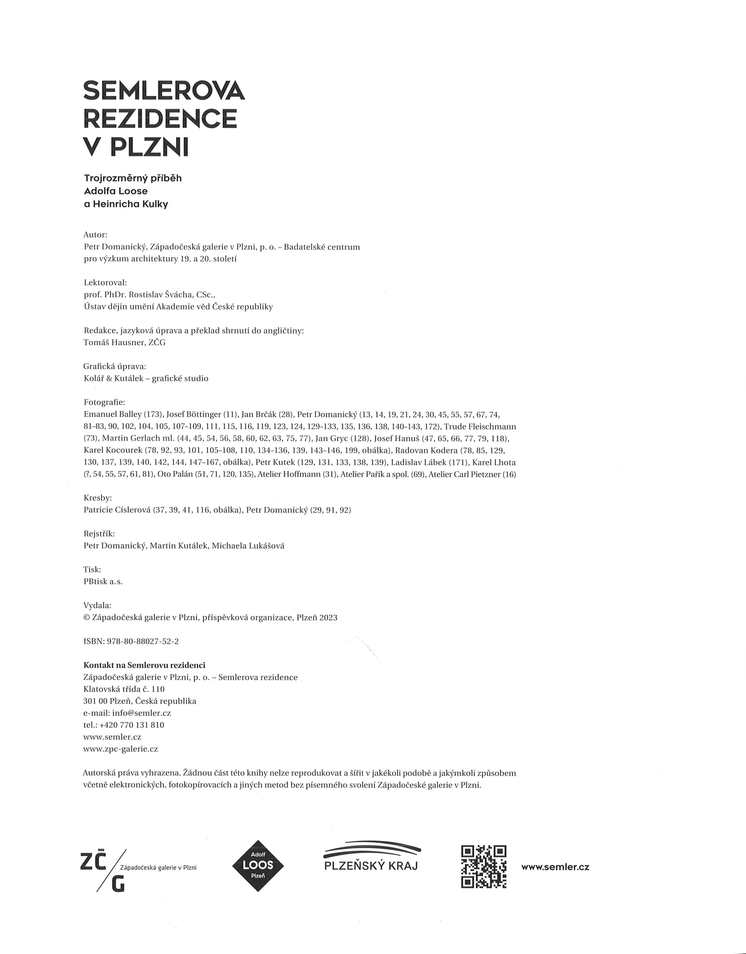 Názvové údaje Semlerova rezidence v Plzni : trojrozměrný příběh Adolfa Loose a Heinricha Kulky / Petr Domanický Osobní jméno Domanický, Petr, 1973- (Autor) Další autoři Západočeská galerie (Plzeň, Česko) (Nakladatel, vydavatel) Kolář & Kutálek (grafické studio) (Knižní grafik) PBtisk (tiskárna) (Tiskař) Nakladatel Plzeň : Západočeská galerie v Plzni, [2023] Výrobce [Příbram] : PB tisk Copyright ©2023 Rozsah 197 stran : ilustrace (převážně barevné), fotografie, portréty, plány, faksimile ; 27 cm ISBN 978-80-88027-52-2 (brožováno) Země vyd. Česko Jazyk dok. čeština Poznámky Zdobená obálka s fotografií interiéru. - Na přední záložce obálky rodinná fotografie, na zadní záložce informace o autorovi. - Na předsádkách plány, klíčová data, fotografie. - V textu černobílé i barevné fotografie, portréty, faksimile dokumentů. - Úvod. - Biografické údaje. - Poznámky