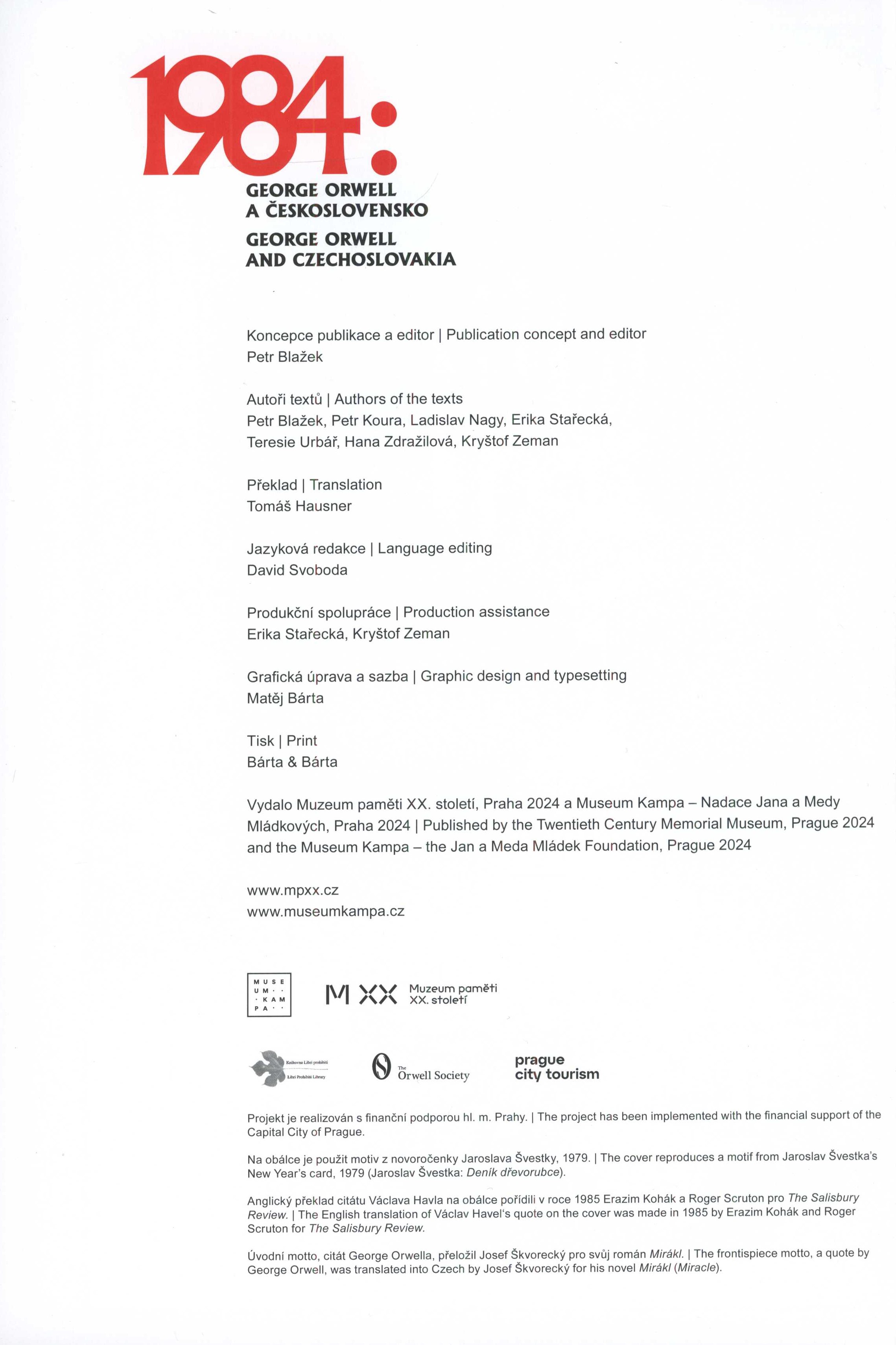 Title information 1984 : George Orwell a Československo = George Orwell and Czechoslovakia / Petr Blažek (ed.) ; překlad Tomáš Hausner ; grafická úprava a sazba Matěj Bárta Další autoři Blažek, Petr, 1973- (Editor) Hausner, Tomáš (Translator) Bárta, Matěj, 1977- (Book designer) (Compositor) Corporation Muzeum paměti XX. století (Praha, Česko) (Publisher) Muzeum Kampa (Publisher) Bárta & Bárta (firma) (Printer) Publication Praha : Muzeum paměti XX. století : Museum Kampa - Nadace Jana a Medy Mládkových, 2024 Manufacture Bárta & Bárta Scope 149 stran : ilustrace (některé barevné), portréty, faksimile ; 30 cm ISBN 978-80-909249-0-1 (brožováno) Country Czech Republic Language Czech * English Language of the original Czech Note Zdobená barevná obálka. - Obsah. - Předmluva. - Úvod. - Poděkování. - Barevné, tónované a černobílé fotografie, portréty, ilustrace a faksimile. - Příloha. - Na zadní straně obálky anotace knihy.