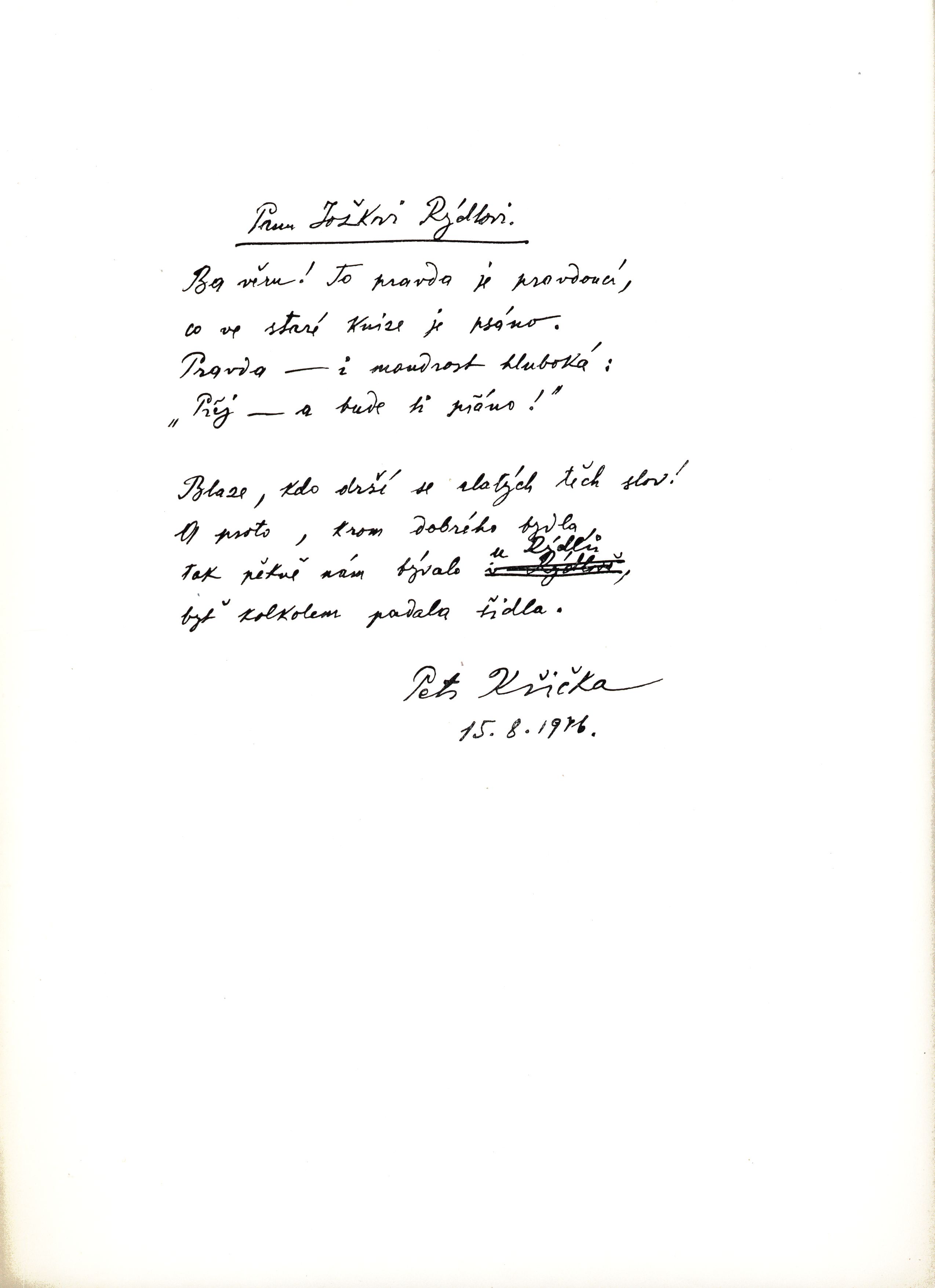 Poznámka o dalších původcích Jako svůj sokromý a neprodejný tisk vydal Josef Rýdl, vytiskl Karel Kryl. Druh dok. monografie Klíčová slova česká próza * poválečná literatura * soukromý tisk * bibliofilie * vlastenectví * české země * rodný kraj Uživatelské pole PNP Sign. JVladislav 2492: Podpis autora a ilustrátora na vakátu, připojen přípisek "V upomínku věnuje Josef Rýdl". Po titulním listu následuje dedikace "Panu Jožkovi Rýdlovi..." od autora z 15. 8. 1976(?). Signatura Přír.číslo Lokace Info JVladislav 2492 1607/2024 Sbírka