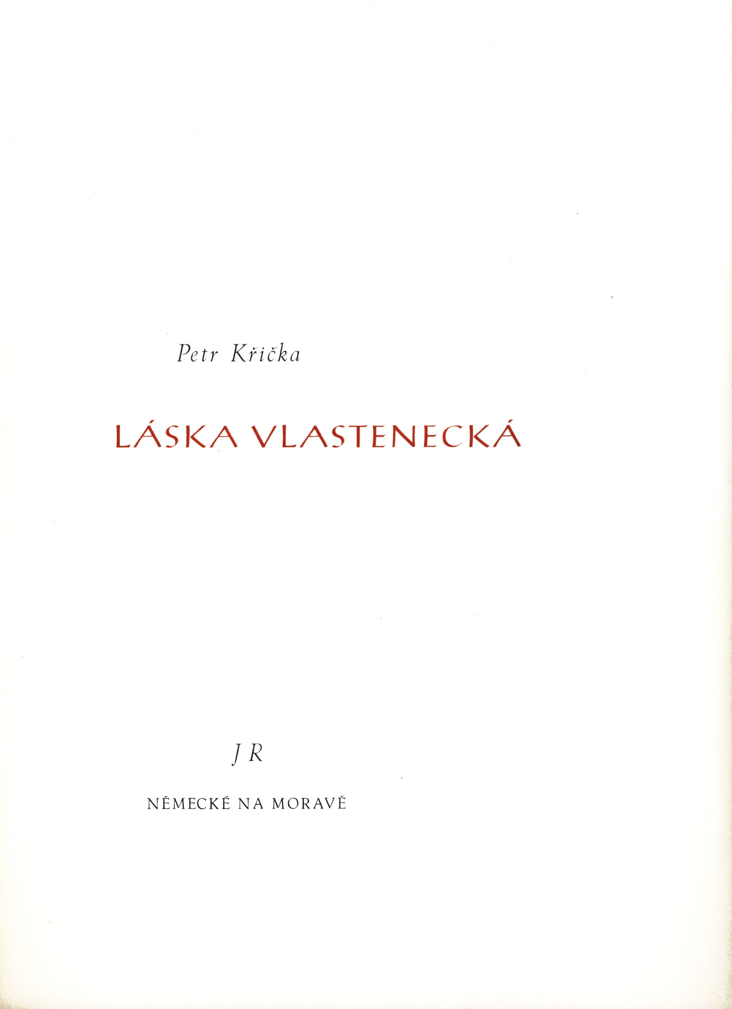 Názvové údaje Láska vlastenecká / Petr Křička ; šest kreseb Josefa Jambora Osobní jméno Křička, Petr, 1884-1949 (Autor) (Autor podpisu) (Dedikátor) Další autoři Jambor, Josef, 1887-1964 (Ilustrátor) (Autor podpisu) Rýdl, Josef (Dedikátor) (Nakladatel, vydavatel) Korp. Karel Kryl (firma: Kroměříž, Česko) (Tiskař) Nakladatel v Německém na Moravě : Josef Rýdl, [1949] Výrobce v Kroměříži : Karel Kryl Rozsah 7 volných dvojlistů : ilustrace ; 33 cm ISBN (volné listy) Země vyd. Česko Jazyk dok. čeština Poznámky Jednoduchá nezdobená obálka. - Volné dvojlisty v přebalu. - Ilustrace na frontispice. - Dvoubarevný titulní list. - Tiráž. - Celostránkové černobílé ilustrace.