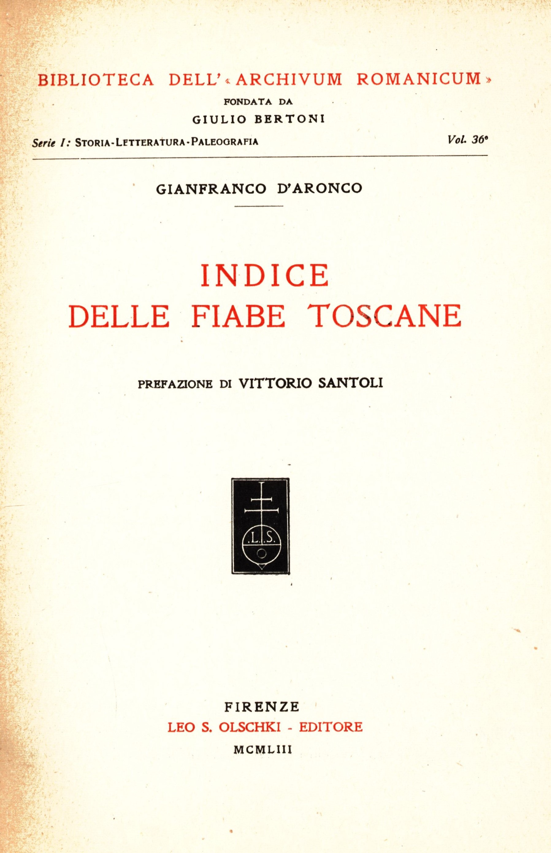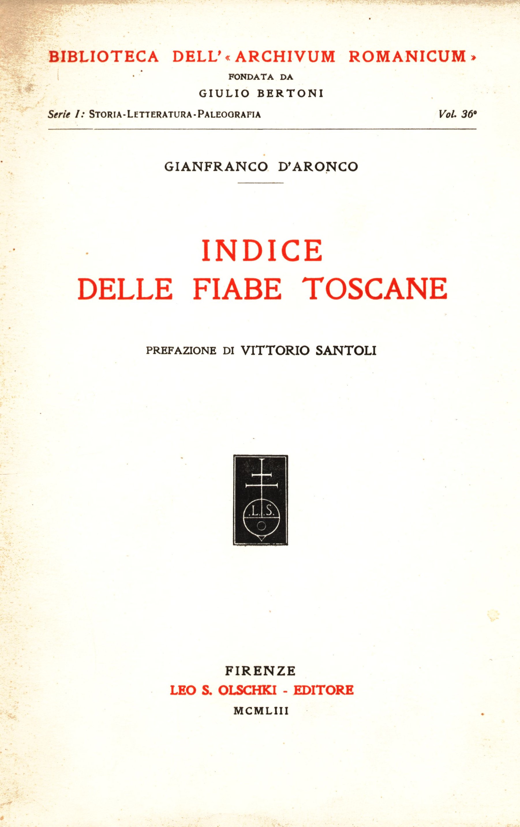 Názvové údaje Indice delle fiabe toscane / Gianfranco D'Aronco ; prefazione di Vittorio Santoli Osobní jméno D'Aronco, Gianfranco, 1920-2019 (Autor) Další autoři Santoli, Vittorio, 1901-1971 (Autor úvodu atd.) Korp. Leo S. Olschki (firma) (Nakladatel, vydavatel) Nakladatel Firenze : Leo S. Olschki, 1953 Výrobce Udine : Tipografia G. B. Doretti Rozsah 233 stran ; 26 cm ISBN (vázáno) Edice Biblioteca dell'Archivum Romanicum. Serie I: Storia, Letteratura, Paleografia ; Vol. 36