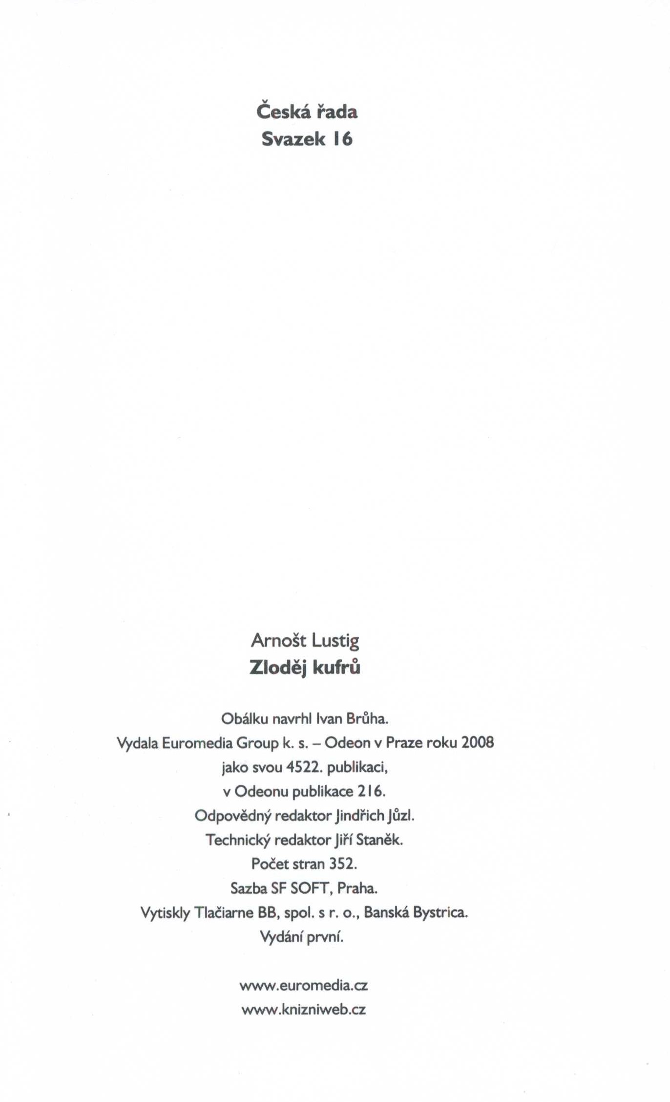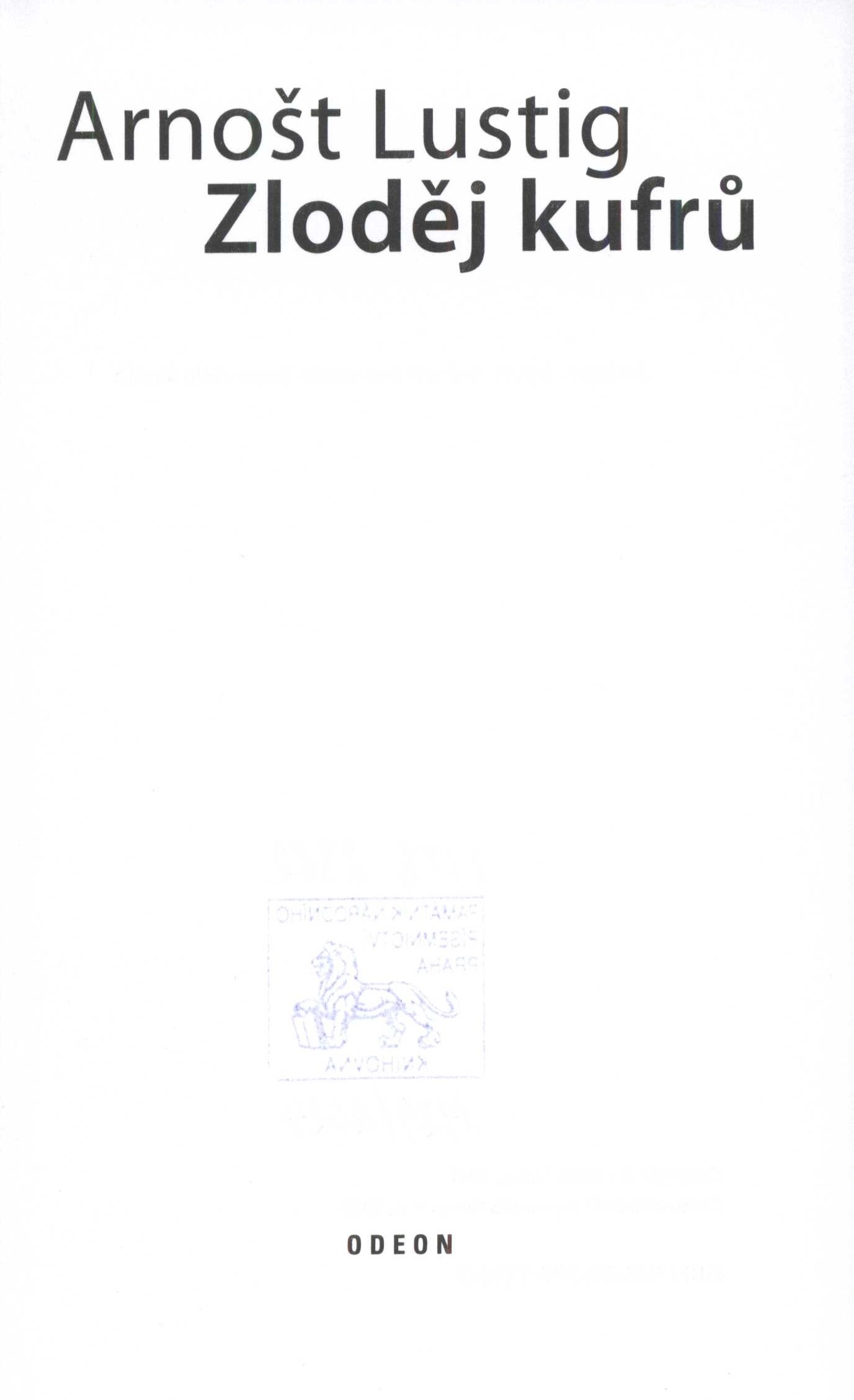 Názvové údaje Zloděj kufrů / Arnošt Lustig ; obálku navrhl Ivan Brůha Osobní jméno Lustig, Arnošt, 1926-2011 (Autor) Další autoři Brůha, Ivan, 1960- (Autor obálky) Korp. Odeon (nakladatelství) (Nakladatel, vydavatel) Tlačiareň BB (tiskárna) (Tiskař) Údaje o vydání Vydání první Nakladatel V Praze : Odeon, 2008 Výrobce Banská Bystrica : Tlačiarne BB, spol. s r.o. Rozsah 345 stran ; 21 cm ISBN 978-80-207-1281-3 (vázáno) Edice Česká řada ; svazek 16