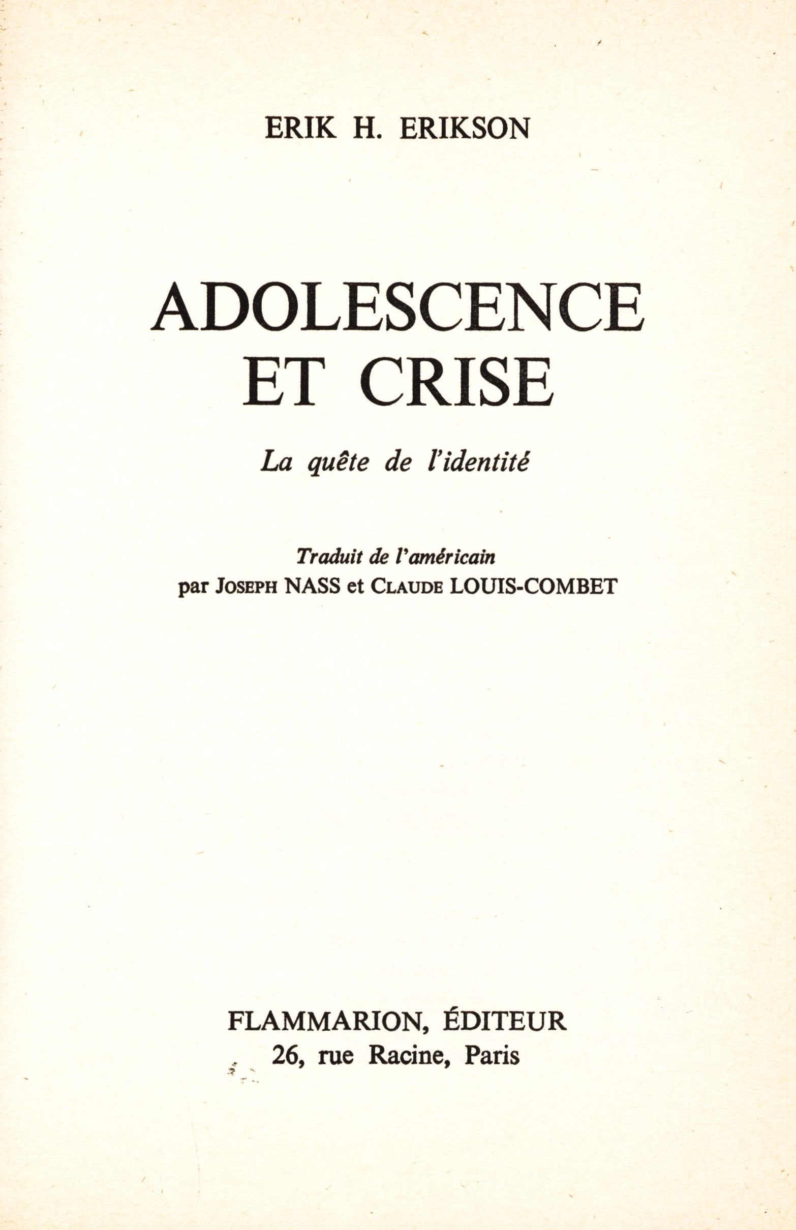 Názvové údaje Adolescence et crise : la quête de l'identité / Erik H. Erikson ; Traduit de l'américain par joseph Nass et Claude Louis-Combet Osobní jméno Erikson, Erik H. (Erik Homburger), 1902-1994 (Autor) Další autoři Nass, Joseph (Překladatel) Louis-Combet, Claude, 1932- (Překladatel) Korp. Flammarion (nakladatelství) (Nakladatel, vydavatel) Bussière (firma) (Tiskař) Nakladatel Paris : Flammarion, 1976 Výrobce Saint-Amand : Bussière Rozsah 328 stran ; 21 cm ISBN 2-08-210183-5 (vázáno) Edice Nouvelle bibliothèque scientifique