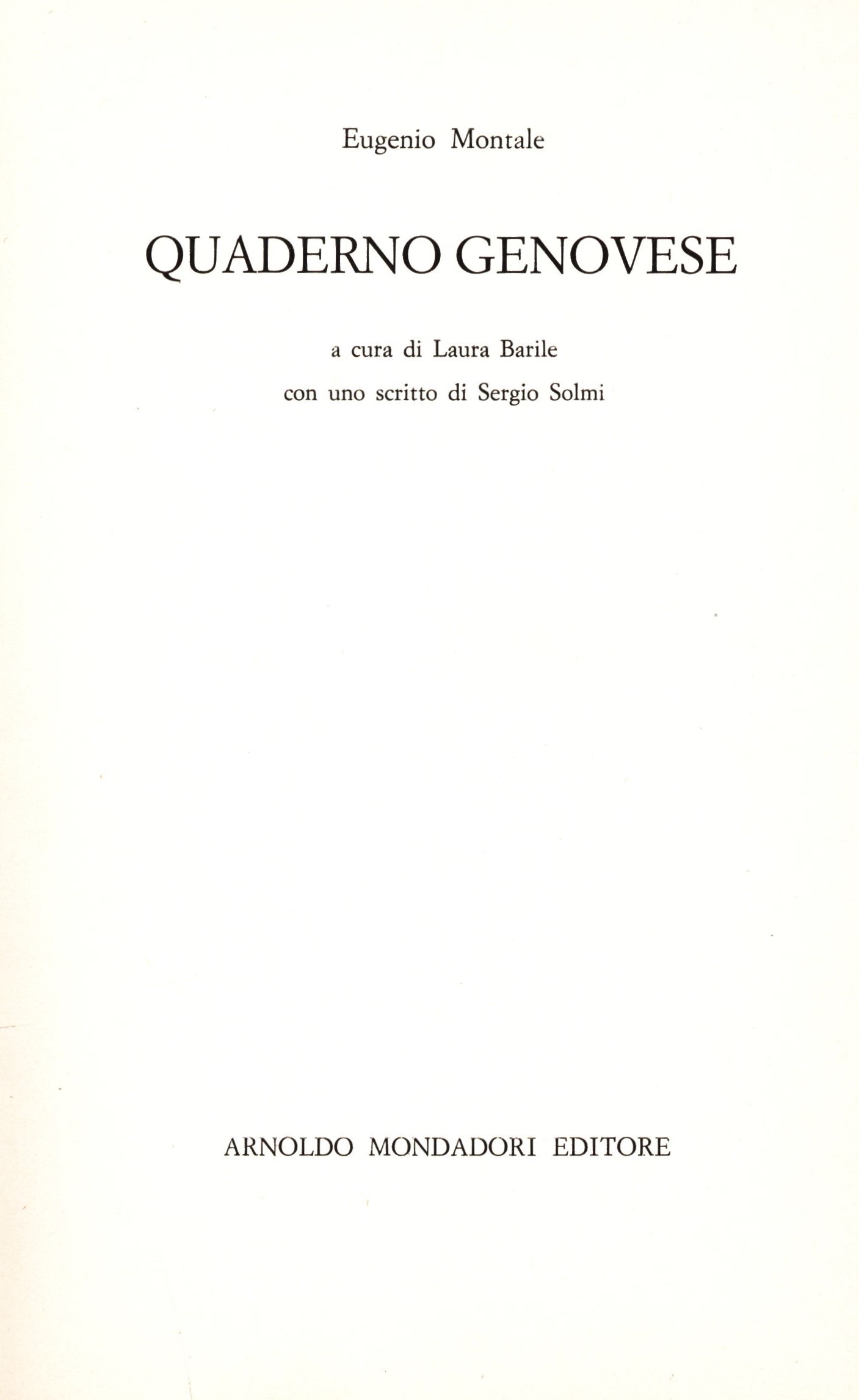 Názvové údaje Quaderno genovese / Eugenio Montale ; a cura di Laura Barile ; con uno scritto di Sergio Solmi Osobní jméno Montale, Eugenio, 1896-1981 (Autor) Další autoři Barile, Laura, 1942- (Editor) Solmi, Sergio, 1899-1981 (Přispěvatel) Korp. Arnoldo Mondadori editore (Nakladatel, vydavatel) Údaje o vydání I edizione Nakladatel [Milano] : Arnoldo Mondadori editore, 1983 Rozsah 221 stran ; 20 cm ISBN (vázáno) Edice Collezione Passaggi ; 6