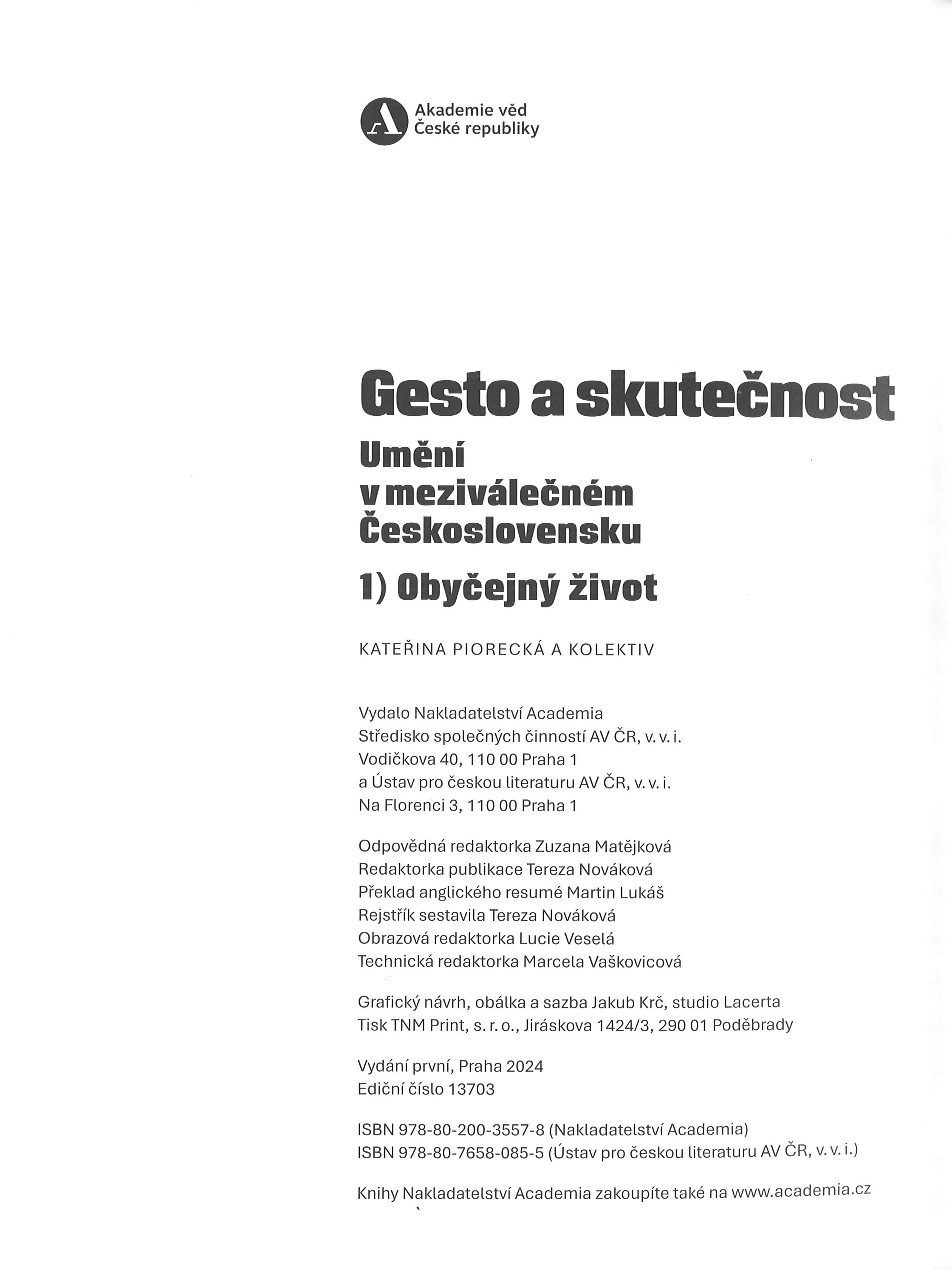 Názvové údaje Gesto a skutečnost : umění v meziválečném Československu. 1, Obyčejný život / Kateřina Piorecká a kolektiv Osobní jméno Piorecká, Kateřina, 1976- (Autor) (Editor) Další autoři Brunová, Marie, 1975- (Editor) Holeček, Lukáš, 1985- (Editor) Lukáš, Martin, 1985- (Editor) Krč, Jakub, 1973- (Knižní grafik) (Autor obálky) (Sazeč) Korp. Academia (nakladatelství) (Nakladatel, vydavatel) Ústav pro českou literaturu (Akademie věd ČR) (Nakladatel, vydavatel) TNM PRINT s. r. o. (tiskárna) (Tiskař) Údaje o vydání Vydání první Nakladatel Praha : Academia : Ústav pro českou literaturu AV ČR, 2024 Výrobce Poděbrady : TNM Print Rozsah 543 stran : ilustrace, fotografie, faksimile ; 27 cm ISBN 978-80-200-3557-8 (Academia ; vázáno) 978-80-7658-085-5 (Ústav pro českou literaturu ; vázáno) Země vyd. Česko Jazyk dok. čeština Poznámky "Hlavní redakce: Kateřina Piorecká ; redakce: Marie Brunová, Lukáš Holeček, Martin Lukáš" preliminaria