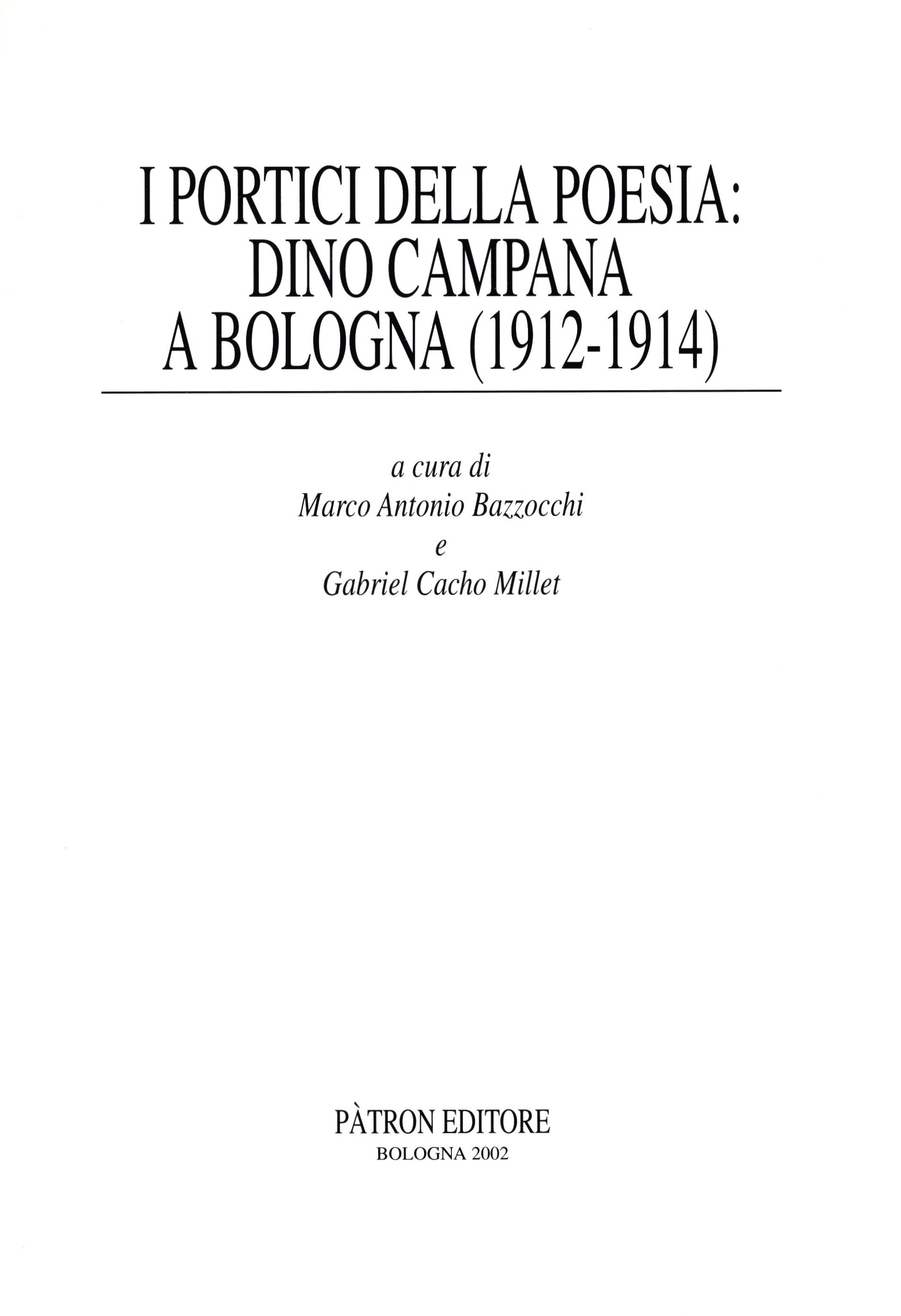 Názvové údaje I portici della poesia : Dino Campana a Bologna (1912-1914) / a cura di Marco Antonio Bazzocchi e Gabriel Cacho Millet Osobní jméno Bazzocchi, Marco Antonio, 1961- (Editor) Další autoři Cacho Millet, Gabriel, 1939-2016 (Editor) Korp. Pàtron editore (Nakladatel, vydavatel) Údaje o vydání prima edizione Nakladatel Bologna : Pàtron editore, 2002 Rozsah 196 stran : fotografie, faksimile ; 24 cm ISBN 88-555-2646-4 (vázáno) Edice Emilia Romagna biblioteche archivi ; 46