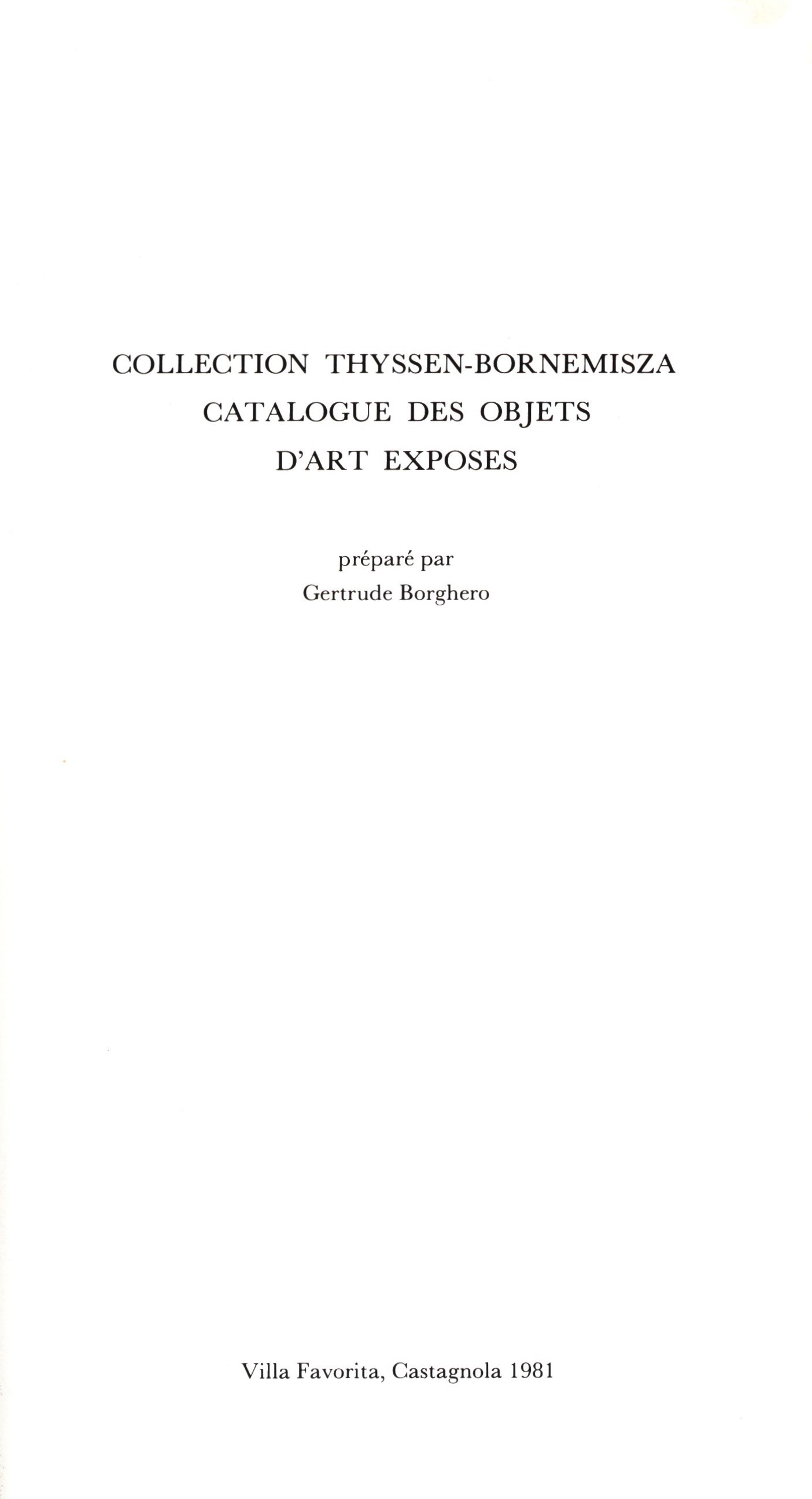 Názvové údaje Collection Thyssen-Bornemisza : catalogue des objets d'art exposes / préparé par Gertrude Borghero Další autoři Borghero, Gertrude (Editor) Korp. Villa favorita (Lugano, Švýcarsko) (Nakladatel, vydavatel) Veladiny (firma) (Tiskař) Nakladatel Castagnola : Villa Favorita, 1981 Výrobce Lugano : Veladini & Co. SA Rozsah 367 stran : reprodukce, fotografie, půdorysy ; 22 cm ISBN (brožováno) Země vyd. Švýcarsko Jazyk dok. francouzština Poznámky Barevná ilustrovaná obálka. - Fotografie vily na frontispice. - Černobílý titulní list. - Půdorys budovy. - Barevné reprodukce uměleckých děl, popisy děl číslovány.