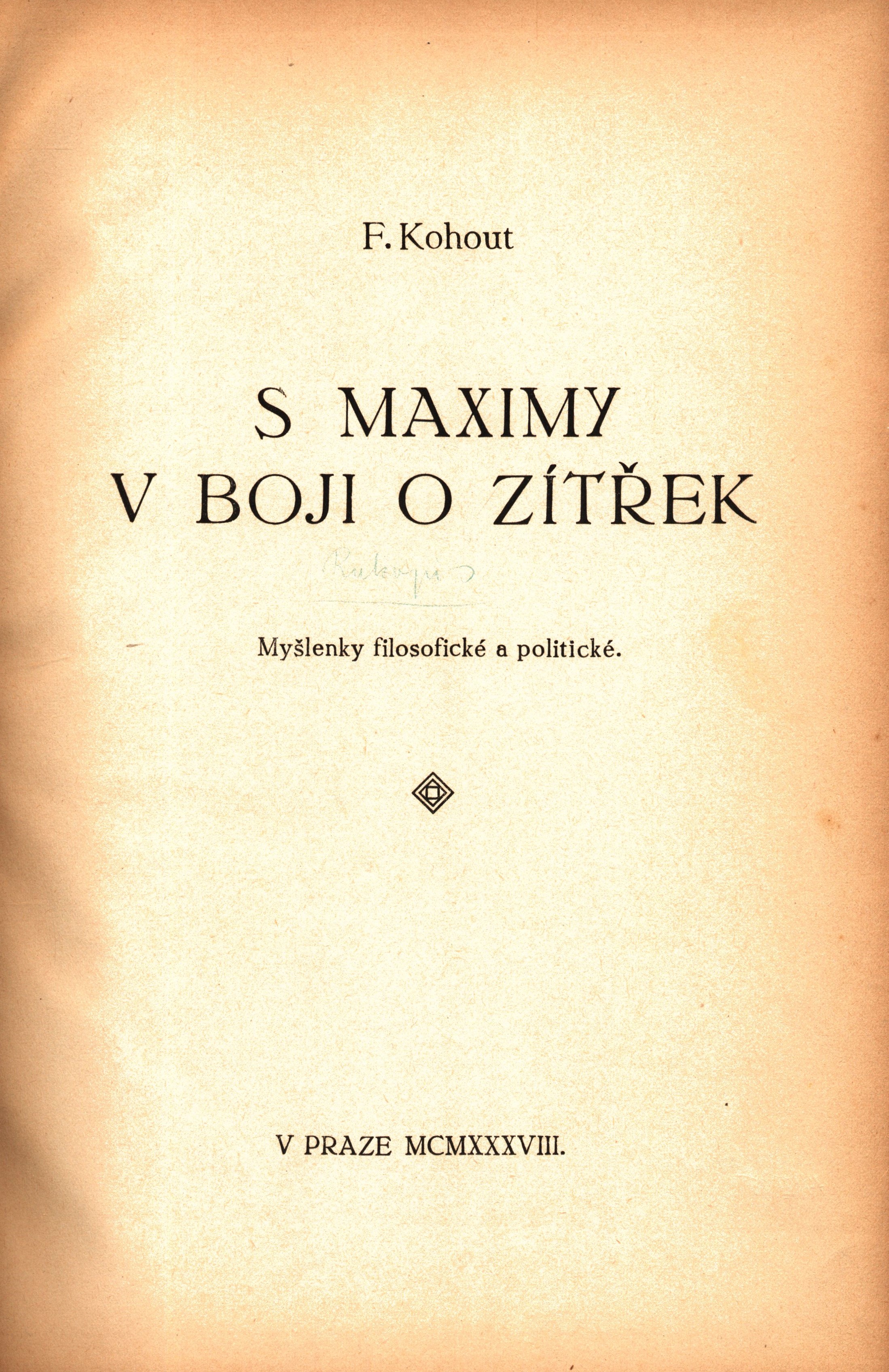 Title information S maximy v boji o zítřek : myšlenky filosofické a politické / F. Kohout Personal name Kohout, F. (Author) Publication V Praze : [nakladatel není známý], 1938 Manufacture Grafotyp Scope 74 stran ; 30 cm ISBN (vázáno) Country Czech Republic Language Czech Note Obálka s vlepeným štítkem. - Titulní list. - Strojopis.