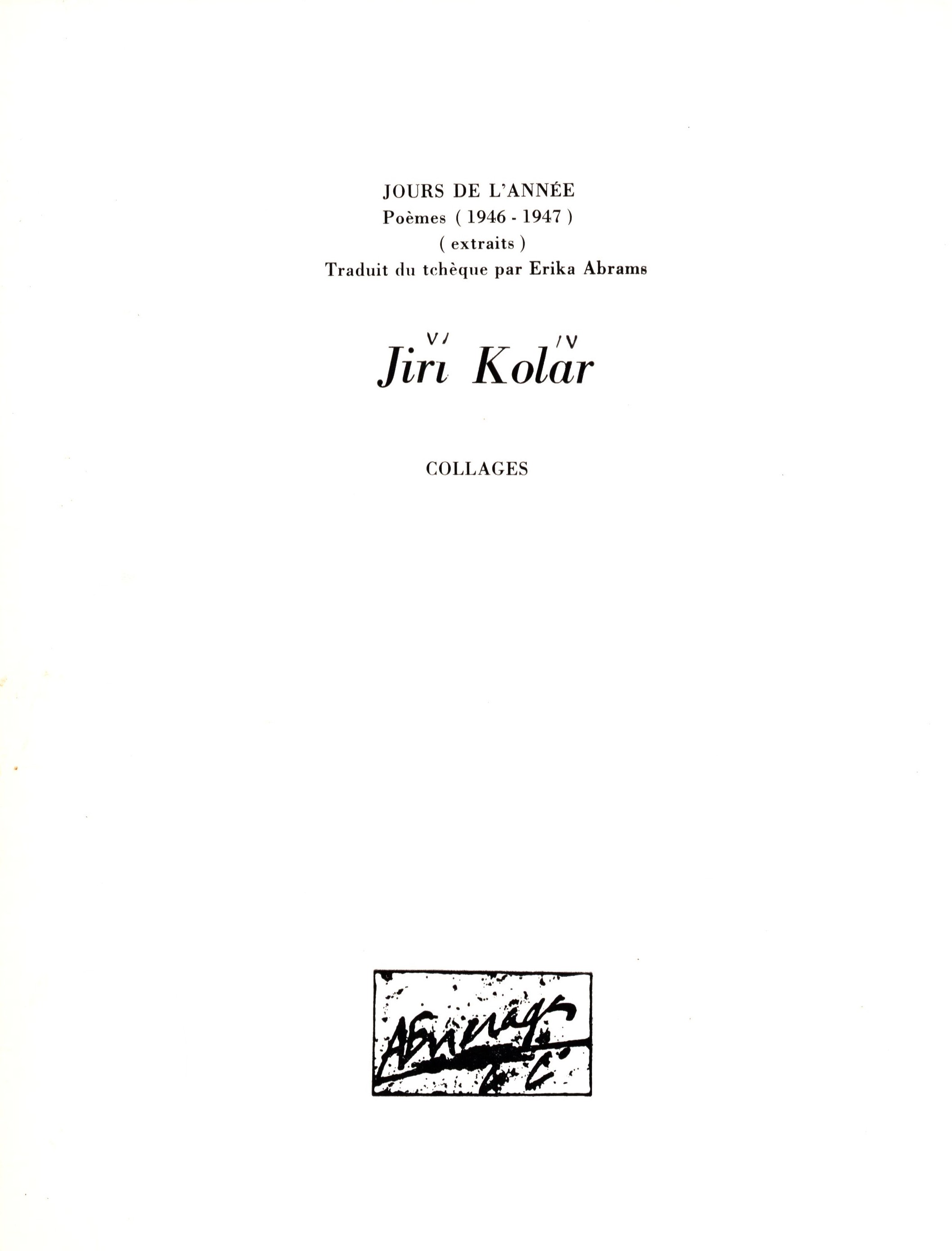 Názvové údaje Jours de l'année : Poèmes (1946-1947)/ Jiří Kolář ; Traduit du tchèque par Erika Abrams Osobní jméno Kolář, Jiří, 1914-2002 (Autor) Další autoři Abrams, Erika, 1952- (Překladatel) Korp. AEncrages & Co (Nakladatel, vydavatel) Nakladatel Bois-de-Champ : AEncrages & Co, [1984] Copyright ©1984 Rozsah 4 nečíslované dvojlisty : koláže ; 24 cm ISBN (volné listy) Země vyd. Francie Jazyk dok. francouzština Jazyk orig. čeština Poznámky Obálka a titulní list s nakladatelským signetem. - Celostránkové koláže. - Volné dvojlisty.