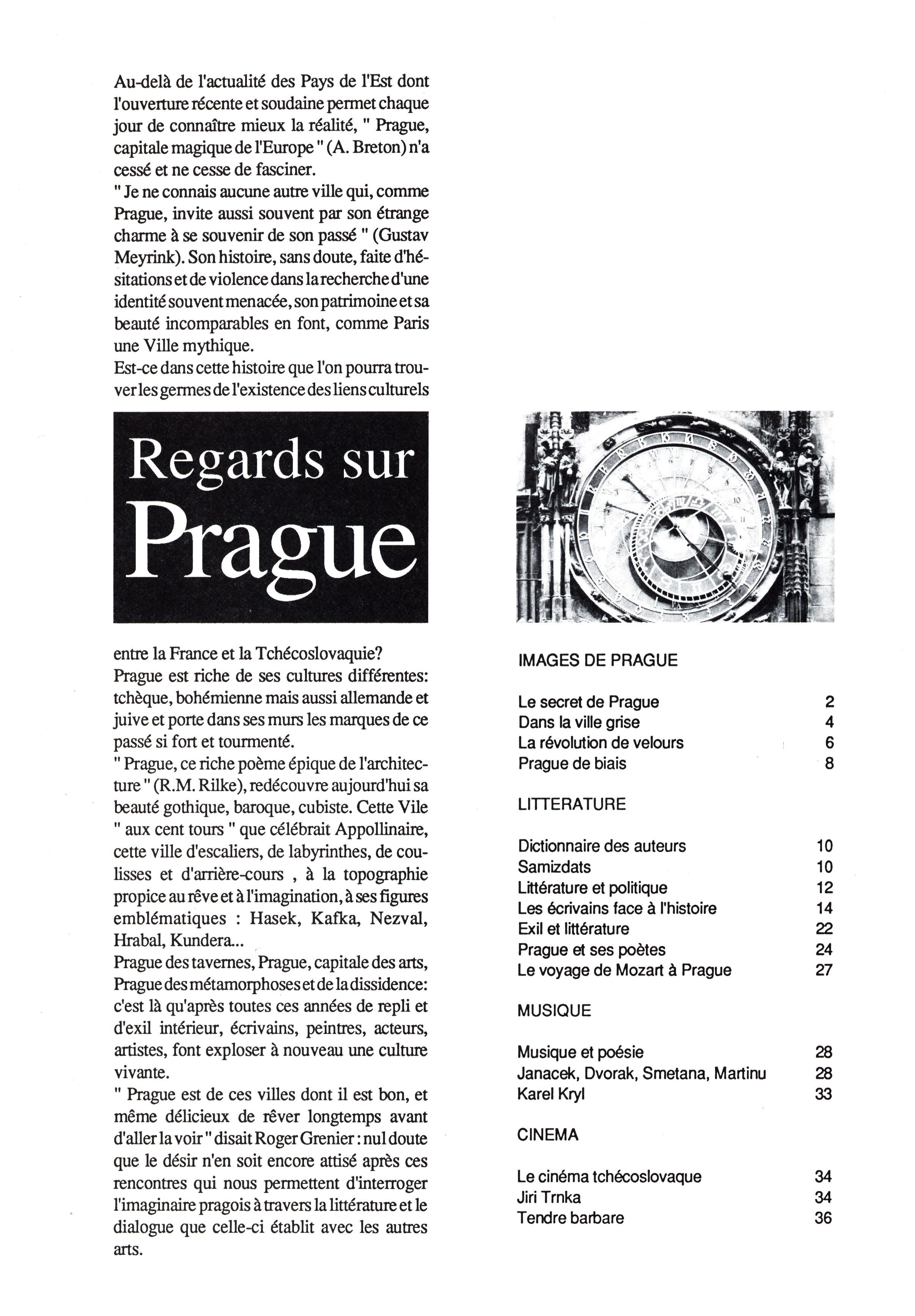Názvové údaje Regards sur Prague : Grenoble 10-31 mars 1992 Nakladatel [Grenoble : nakladatel neznámý], 1992 Výrobce Service Reprographie de la Ville de Grenoble Rozsah 36 stran : fotografie, ilustrace ; 30 cm ISBN (brožováno) Země vyd. Francie Jazyk dok. francouzština Poznámky Zdobená typografická obálka. - Obsah. - Černobílé fotografie a ilustrace. - Malý slovník spisovatelů, hudebníků, filmařů.