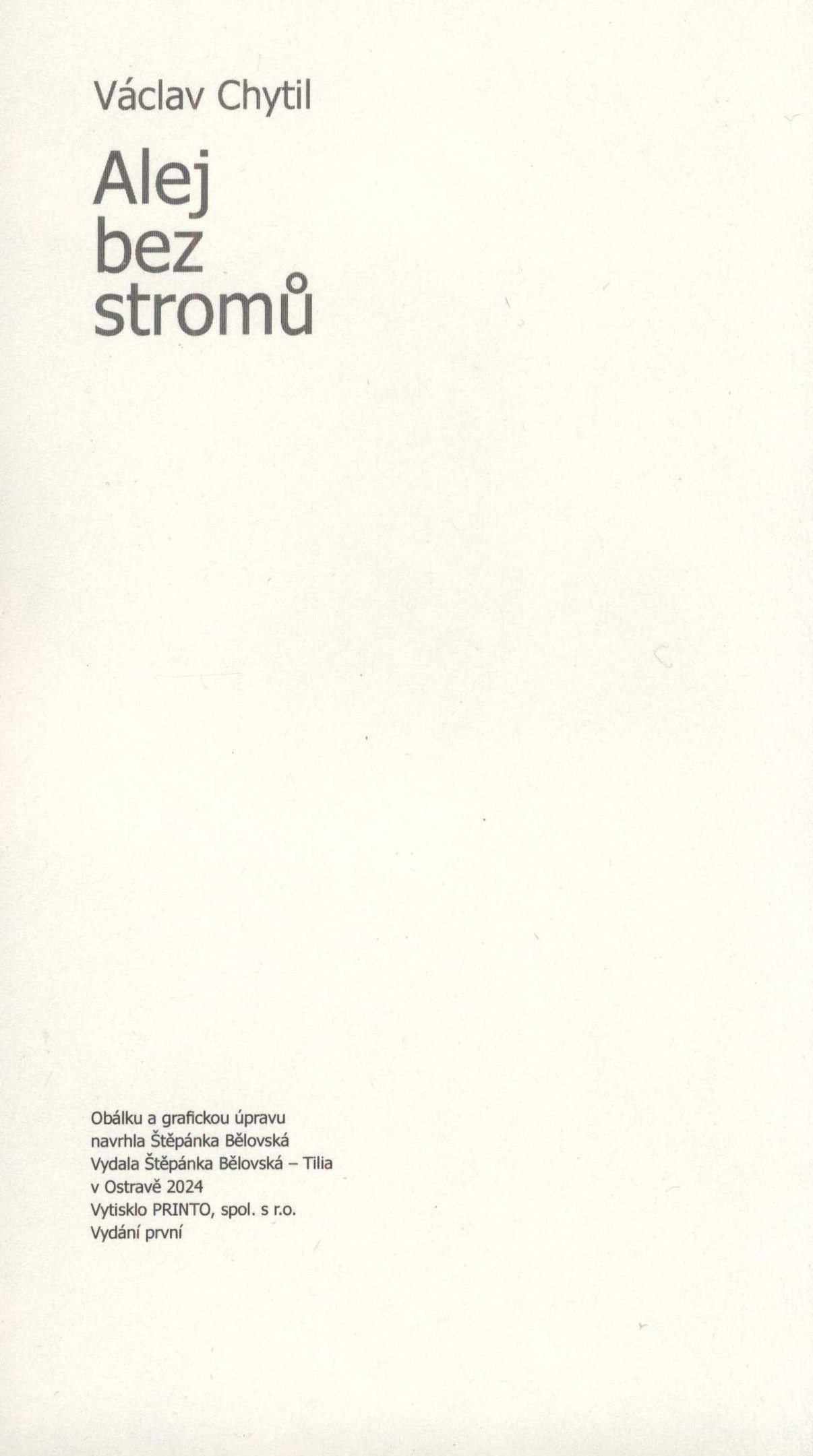 Názvové údaje Alej bez stromů / Václav Chytil ; obálku a grafickou úpravu navrhla Štěpánka Bělovská Osobní jméno Chytil, Václav, 1943-2016 (Autor) Další autoři Bělovská, Štěpánka, 1972- (Autor obálky) (Knižní grafik) Korp. Nakladatelství Tilia (Nakladatel, vydavatel) Printo, spol. s r. o. (tiskárna) (Tiskař) Údaje o vydání Vydání první Nakladatel Ostrava : Štěpánka Bělovská - Tilia, 2024 Výrobce Printo, spol. s r.o. Rozsah 195 stran ; 19 cm ISBN 978-80-86904-61-0 (brožováno) Země vyd. Česko Jazyk dok. čeština Poznámky Zdobená barevná obálka. - Zdobený rozložený patitul. - Frontispis. - Zdobený titulní list. - Obsah. - Na zadní straně obálky bio-bibliografická poznámka o autorovi s fotem.
