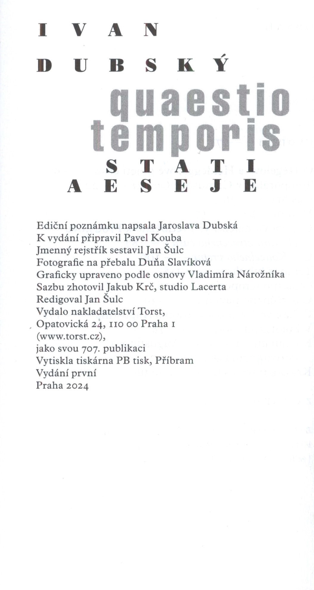 Názvové údaje Quaestio temporis : stati a eseje / Ivan Dubský ; k vydání připravil Pavel Kouba ; ediční poznámku napsala Jaroslava Dubská ; fotografie na přebalu Duňa Slavíková ; graficky upraveno podle osnovy Vladimíra Nárožníka Osobní jméno Dubský, Ivan, 1926-2023 (Autor) Další autoři Kouba, Pavel, 1953- (Editor) Dubská, Jaroslava (Jiná role) Slavíková, Duňa, 1949- (Fotograf) Nárožník, Vladimír, 1939-2002 (Knižní grafik) Korp. Nakladatelství Torst (Nakladatel, vydavatel) PBtisk (tiskárna) (Tiskař) Údaje o vydání Vydání první Nakladatel Praha : Torst, 2024 Výrobce Příbram : PB tisk Rozsah 253 stran ; 20 cm ISBN 978-80-7215-721-1 (vázáno) Země vyd. Česko Jazyk dok. čeština Poznámky Zdobená barevná obálka. - Typografická vazba. - Modré předsádky. - Na přední záložce obálky foto autora, na zadní záložce bio-bibliografická poznámka o něm. - Rozložený titulní list. - Úvodem. - Závěrem. - Ediční poznámka (J. Dubská). - Obsah. - Na zadní straně obálky anotace knihy.