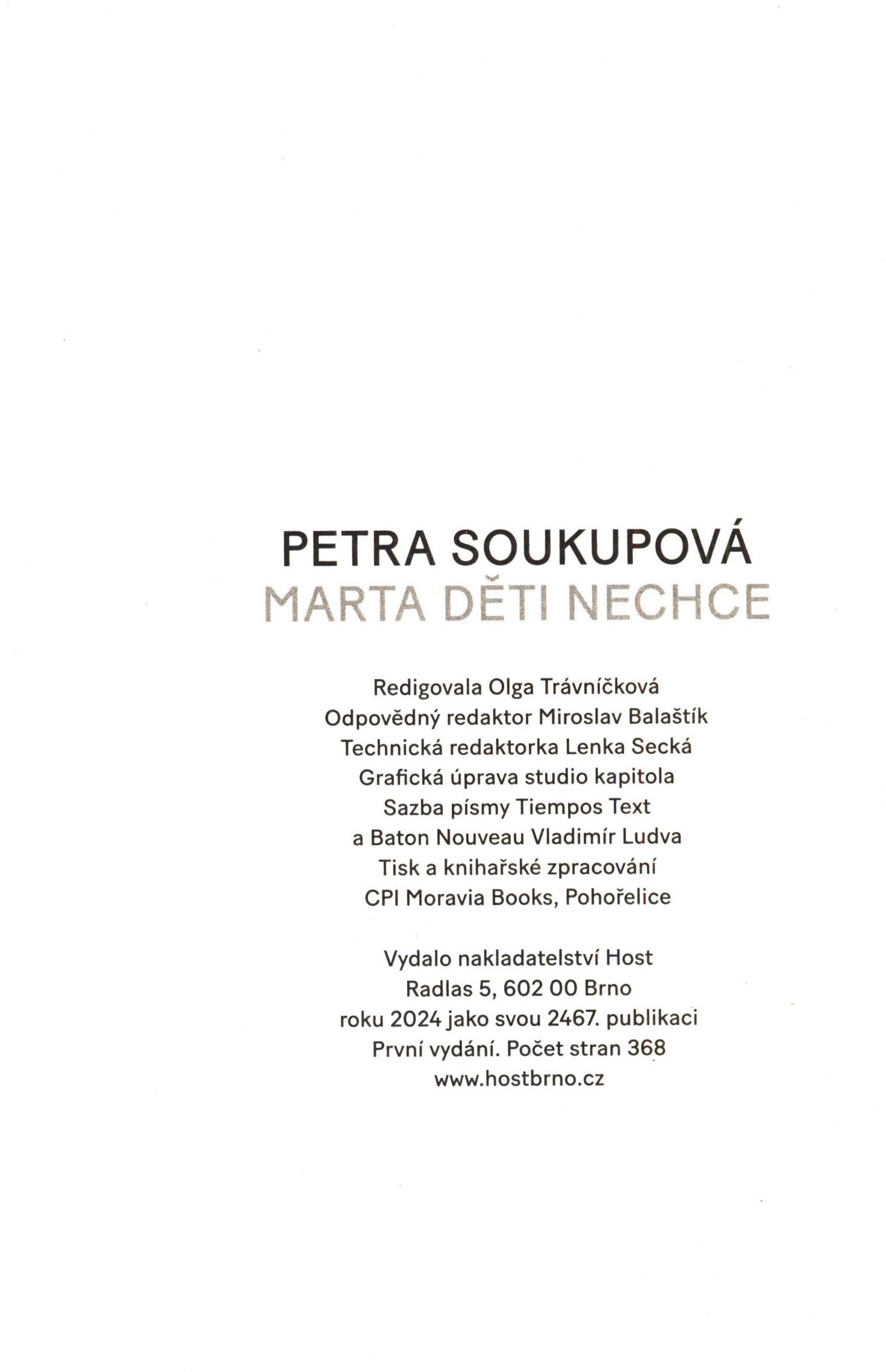 Názvové údaje Marta děti nechce / Petra Soukupová ; obálka a ilustrace Kateřina Kotyk ; grafická úprava studio kapitola Osobní jméno Soukupová, Petra, 1982- (Autor) Další autoři Kotyk, Kateřina, 1995- (Autor obálky) (Ilustrátor) Korp. studio Kapitola (grafické studio) (Knižní grafik) Host (nakladatelství) (Nakladatel, vydavatel) CPI Moravia Books (tiskárna) (Tiskař) Údaje o vydání První vydání Nakladatel Brno : Host, 2024 Výrobce Pohořelice : CPI Moravia Books Rozsah 362 stran ; 21 cm ISBN 978-80-275-2355-9 (vázáno) Země vyd. Česko Jazyk dok. čeština Poznámky Bílá vazba, černobílá vytlačovaná ilustrace, dvoubarevný text (i na hřbetu). - Přední černé předsádky s barevnou mapkou. - Rozložený patitul s ilustrací. - Rozložený titulní list, černobílé ilustrace, dvoubarevný text - Obsah (černobílé ilustrace). - Černobílý kreslený portrét autorky, stručná biografie. - Anotace knihy a drobné černobílé ilustrace na zadní straně vazby.