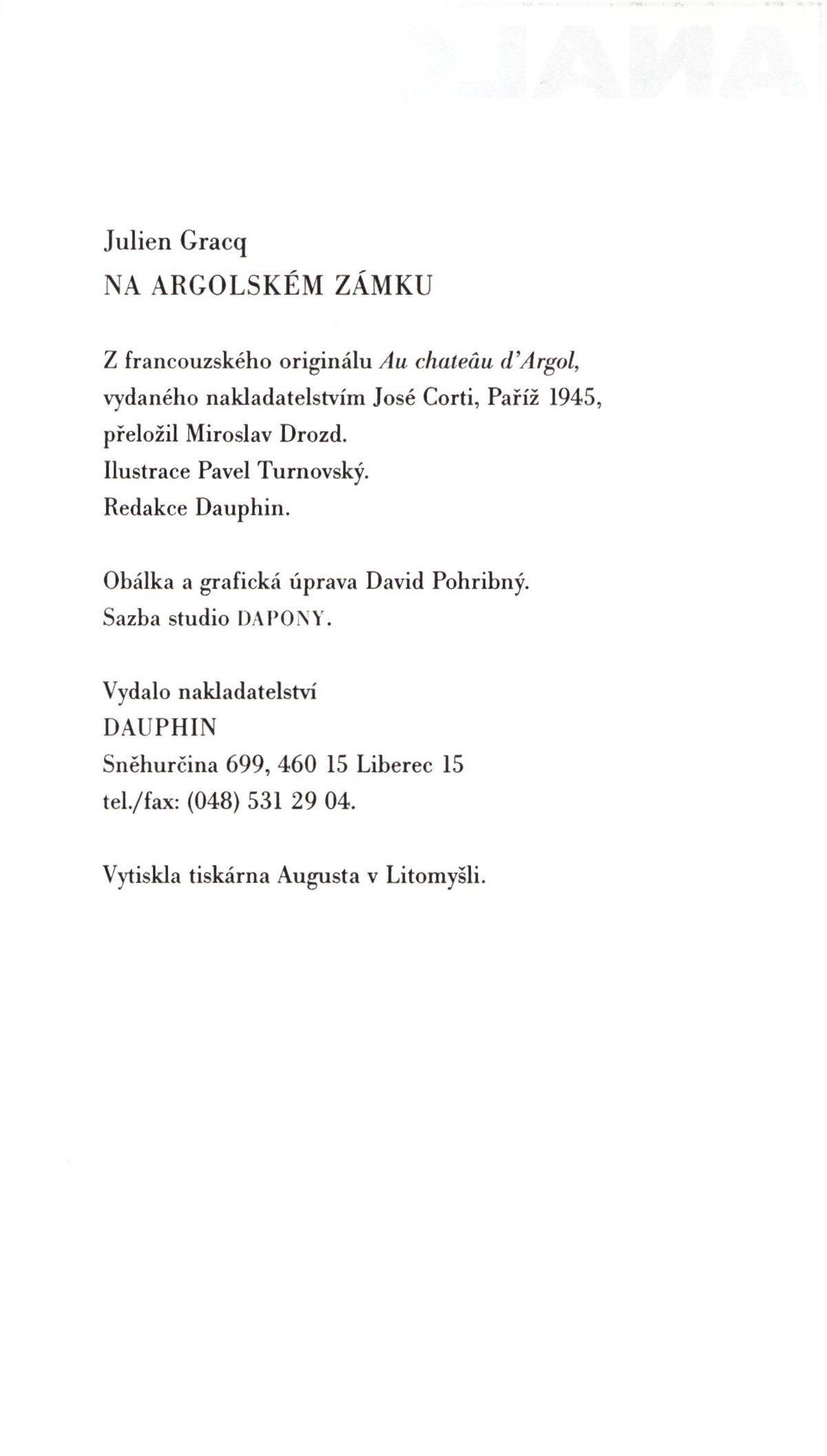 1. Názvové údajeNa argolském zámku / Julien Gracq ; z francouzštiny přeložil Miroslav Drozd ; ilustrace Pavel Turnovský ; obálka a grafická úprava David Pohribný