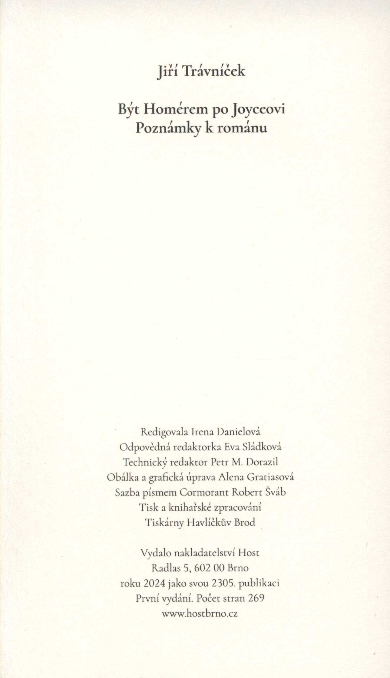Názvové údaje Být Homérem po Joyceovi : poznámky k románu / Jiří Trávníček ; obálka a grafická úprava Alena Gratiasová Osobní jméno Trávníček, Jiří, 1960- (Autor) Další autoři Gratiasová, Alena, 1991- (Autor obálky) (Knižní grafik) Korp. Host (nakladatelství) (Nakladatel, vydavatel) Tiskárny Havlíčkův Brod (firma) (Tiskař) Údaje o vydání První vydání Nakladatel Brno : Host, 2024 Výrobce Tiskárny Havlíčkův Brod Rozsah 265 stran ; 19,5 cm ISBN 978-80-275-1956-9 (brožováno) Země vyd. Česko Jazyk dok. čeština Poznámky Zdobená barevná obálka. - Zdobený titulní list. - Obsah. - Na úvod. - Na vnitřní straně zadní obálky bio-bibliografická poznámka o autorovi. - Na zadní straně obálky anotace knihy.