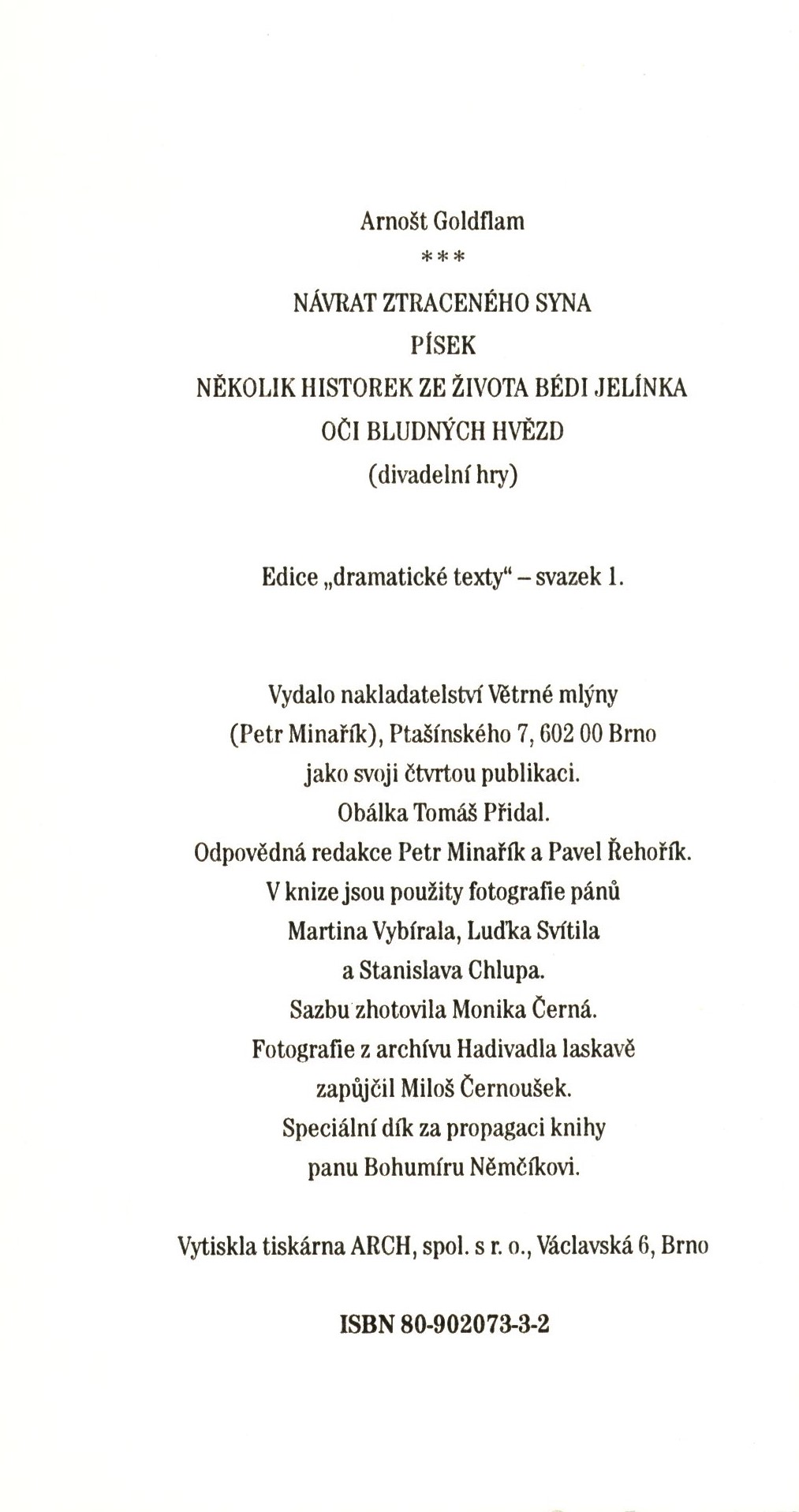 Dramatické texty, (Větrné mlýny)Země vyd. Česko Jazyk dok. čeština Poznámky Ilustrovaná obálka. - Titulní list. - Černobílé ilustrace. - Obsah. - Nakladatelská upoutávka. - Tiráž. - Biografická poznámka s fotografií autora na zadní straně obálky.