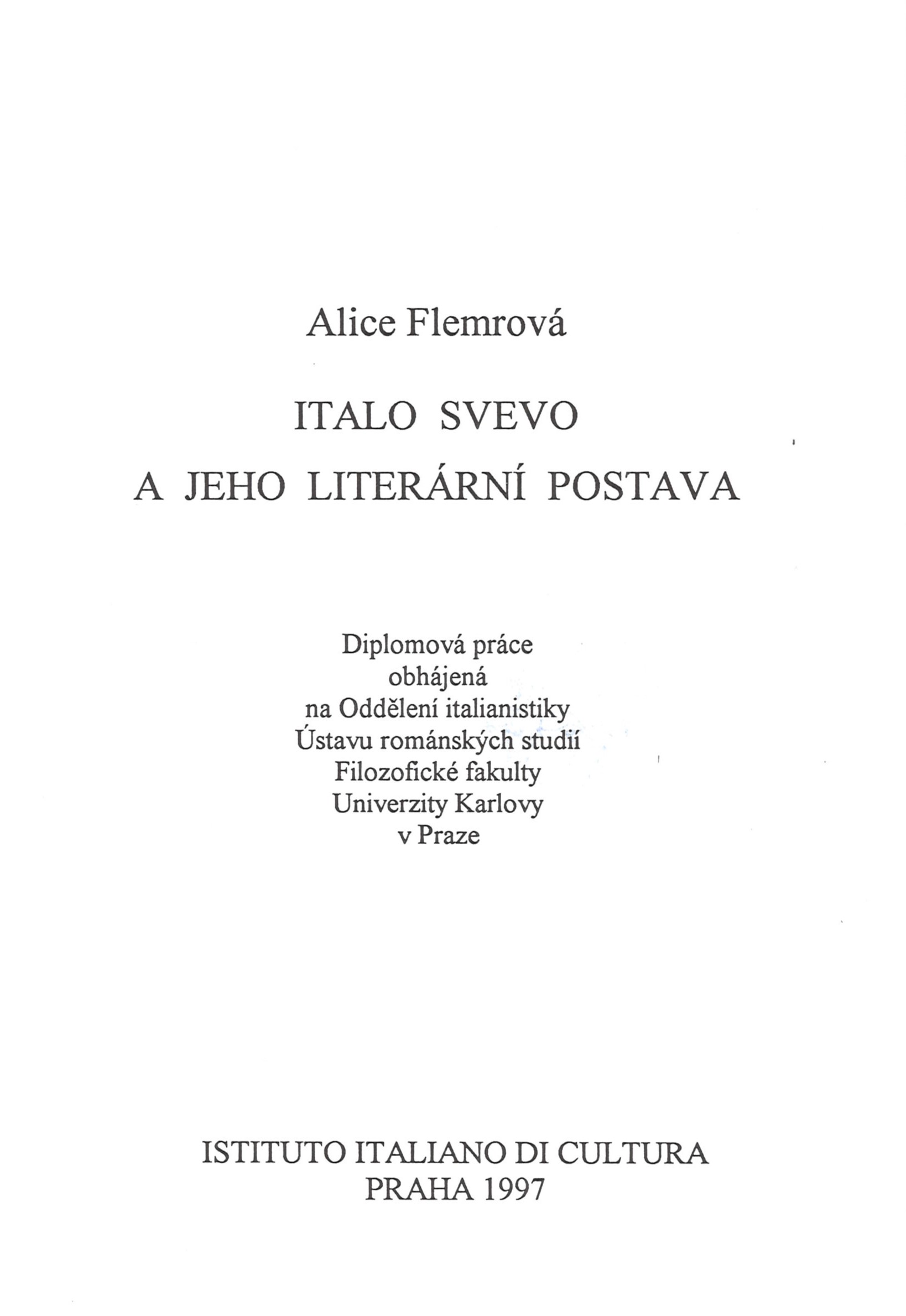 Názvové údaje Italo Svevo a jeho literární postava : diplomová práce obhájená na Oddělení italianistiky Ústavu románských studií Filozofické fakulty Univerzity Karlovy v Praze / Alice Flemrová Osobní jméno Flemrová, Alice, 1970- (Autor) Další autoři Italský kulturní institut (Praha, Česko) (Nakladatel, vydavatel) Pražská imaginace (nakladatelství) (Nakladatel, vydavatel) Nakladatel Praha : Instituto Italiano di Cultura, 1997 Rozsah 141 stran ; 21 cm ISBN 80-7110-170-2 (Pražská imaginace ; brožováno) Edice Collana di italianistica ; svazek 2