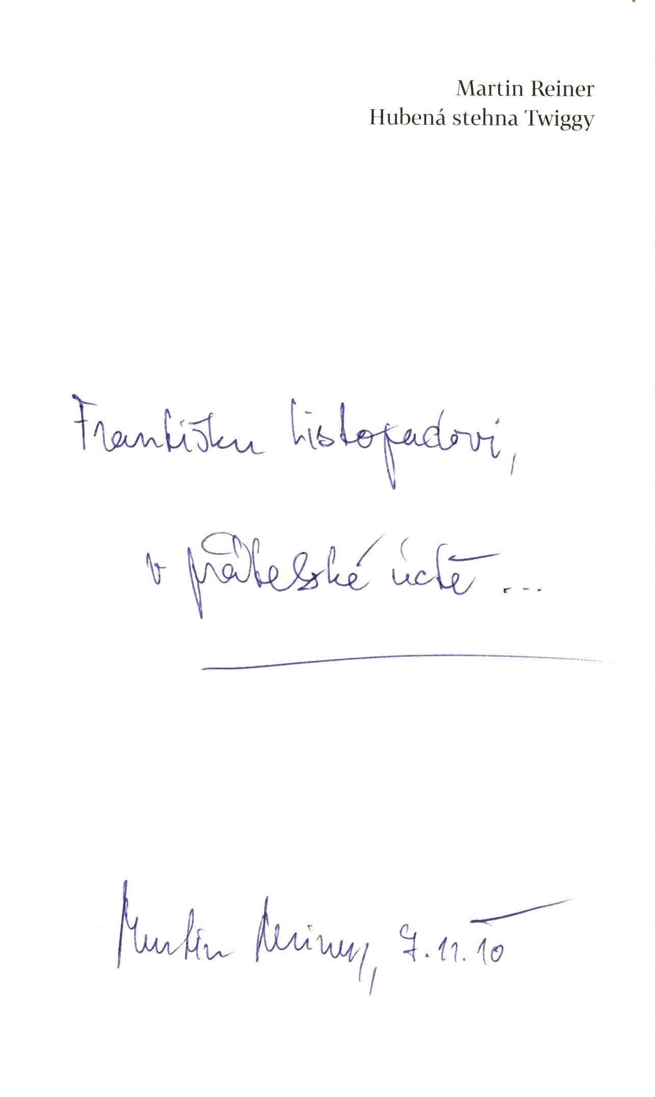 Názvové údaje Hubená stehna Twiggy / Martin Reiner ; fotografický doprovod Dušan Tománek Osobní jméno Reiner, Martin, 1964- (Autor) (Dedikátor) Další autoři Tománek, Dušan, 1973- (Fotograf) Listopad, František, 1921-2017 (Dedikant) Korp. Host (nakladatelství) (Nakladatel, vydavatel) CPI Moravia Books (tiskárna) (Tiskař) Údaje o vydání Vydání první Nakladatel Brno : Host, 2010 Výrobce CPI Moravia Books, s.r.o. Rozsah 103 stran : barevné ilustrace ; 19 cm ISBN 978-80-7294-404-0 (brožováno) Edice ReX ; svazek 9