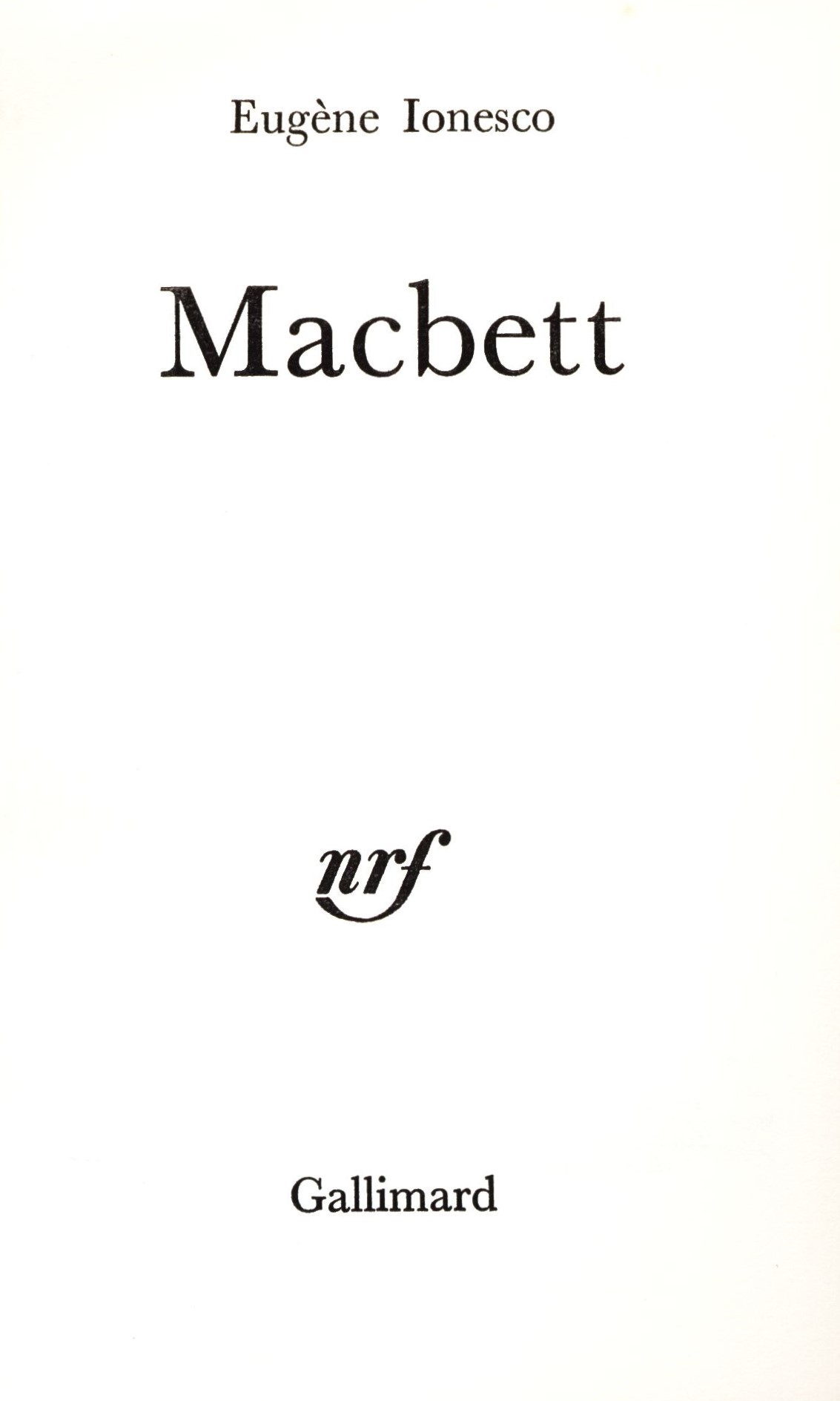 Názvové údaje Macbett / Eugène Ionesco Osobní jméno Ionesco, Eugène, 1909-1994 (Autor) Další autoři Gallimard (firma) (Nakladatel, vydavatel) Floch (francouzská tiskárna) (Tiskař) Nakladatel [Paris] : Gallimard, 1972 Výrobce Mayenne : Floch Rozsah 104 stran ; 16 cm ISBN (brožováno) Edice Le Manteau d'Arlequin (Gallimard)