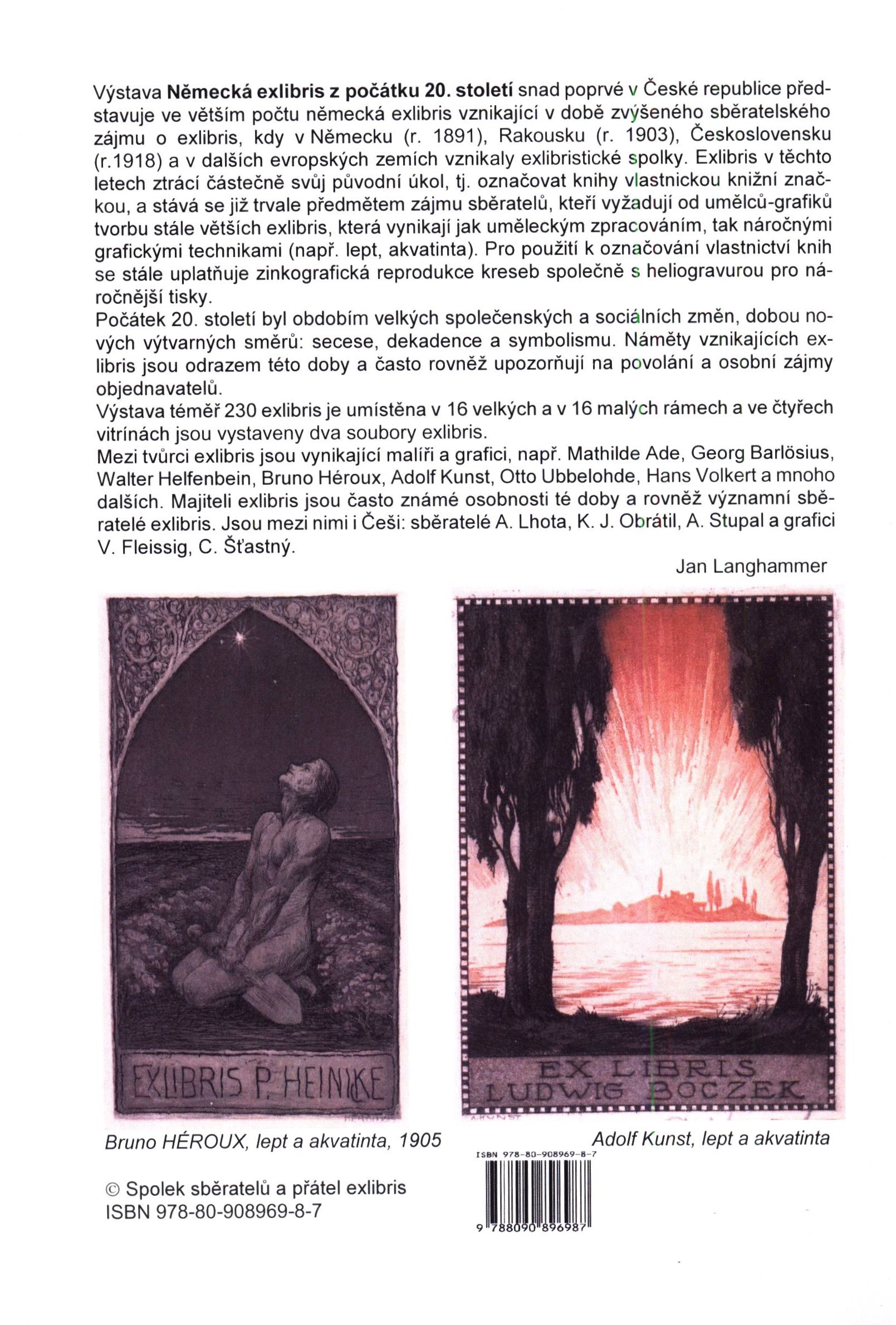 Názvové údaje Německá exlibris z počátku 20. století : katalog výstavy v Galerii Evropského domu, nám. Republiky 12, Plzeň : 5. - 28. 2. 2025 / výstavu a katalog připravil Jan Langhammer ve spolupráci s Oddělením zahraničních knihoven Studijní a vědecké knihovny Plzeňského kraje Osobní jméno Langhammer, Jan, 1939- (Autor) (Kurátor výstavy) Další autoři Studijní a vědecká knihovna Plzeňského kraje. Galerie Evropského domu (Organizátor akce) Spolek sběratelů a přátel exlibris (Nakladatel, vydavatel) Tiskárna Král (Tiskař) Nakladatel Plzeň : Spolek sběratelů a přátel exlibris, 2025 Výrobce Tiskárna Král Rozsah 12 stran : ilustrace (převážně barevné), 21 cm ISBN 978-80-908969-8-7 (brožováno) Země vyd. Česko Jazyk dok. čeština Poznámky Zdobená obálka s reprodukcí exlibris. - Úvodní text Jana Langhammera. - Převážně barevné reprodukce vystavených exponátů i na zadní straně obálky. - Loga zúčastněných institucí - 150 výtisků