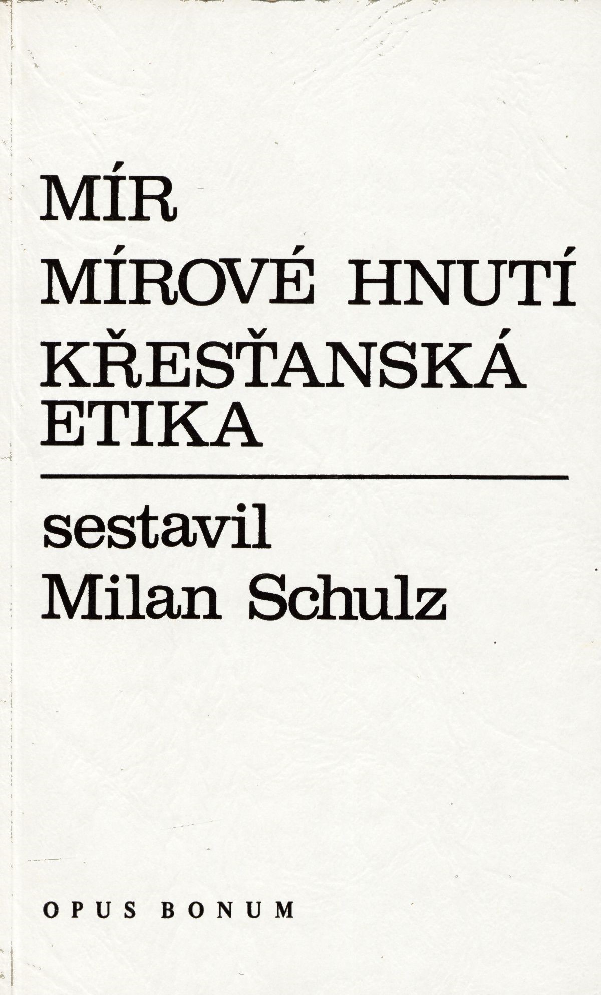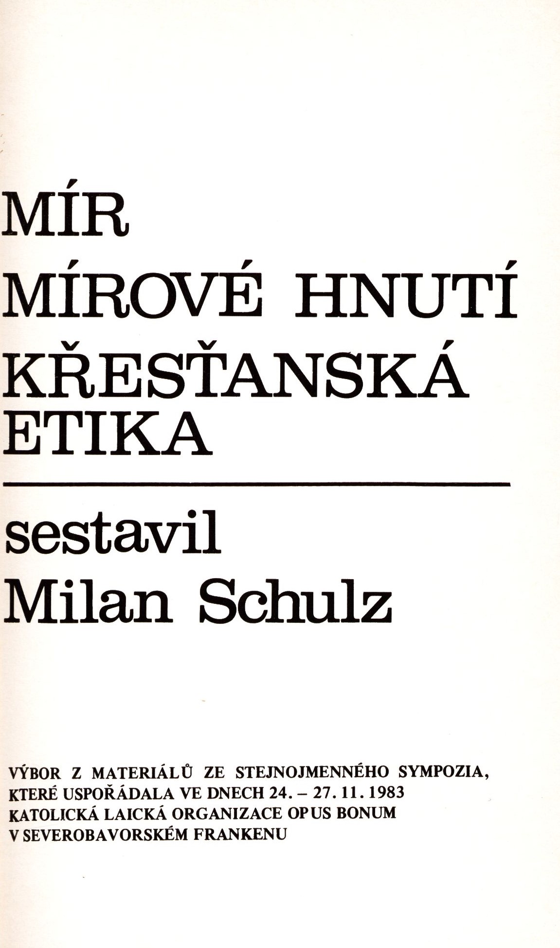 1. Názvové údajeMír, mírové hnutí, křesťanská etika : výbor z materiálů ze stejnojmenného sympozia, které uspořádala ve dnech 24.-27.11.1983 katolická laická organizace Opus bonum v severobavorském Frankenu / sestavil Milan Schulz