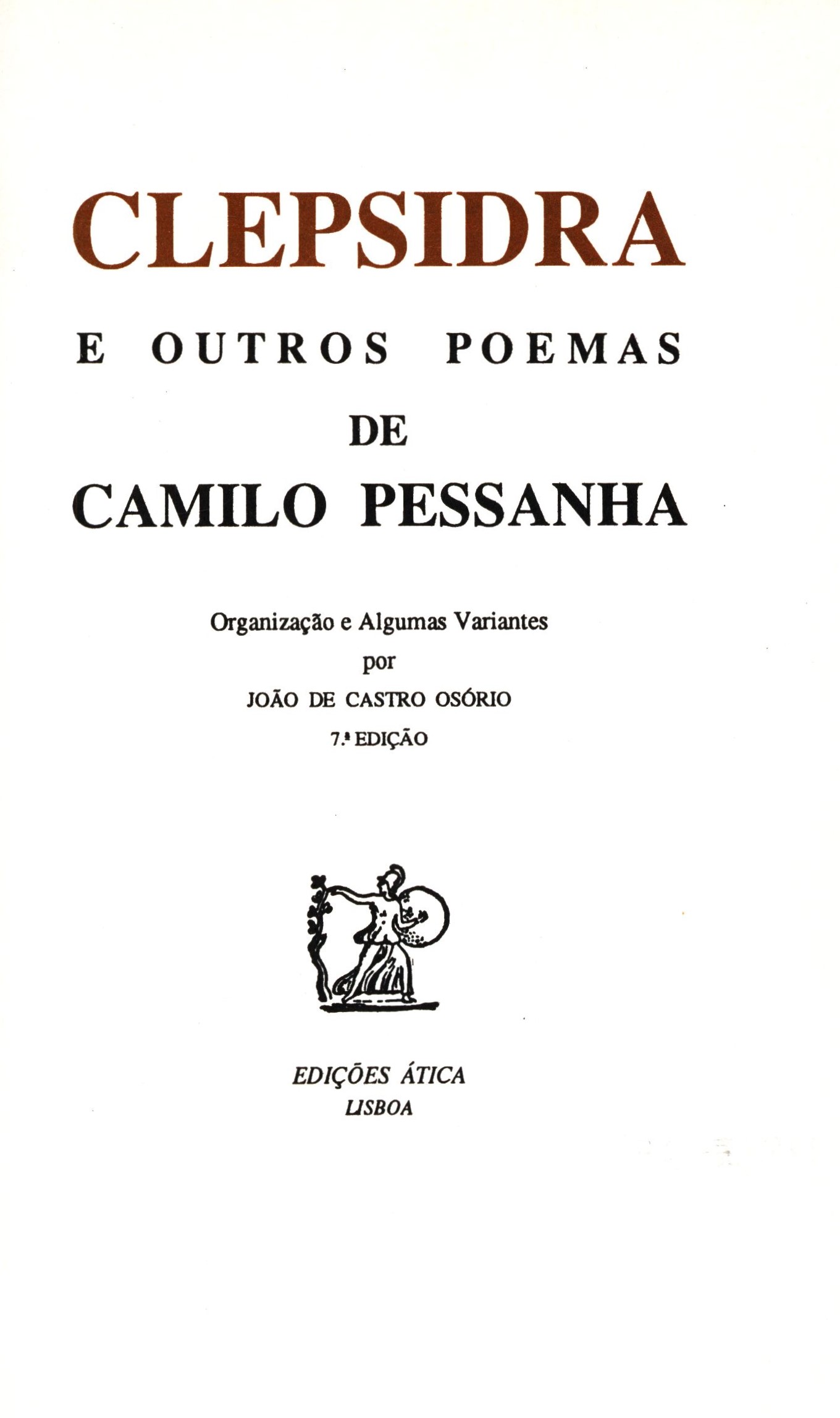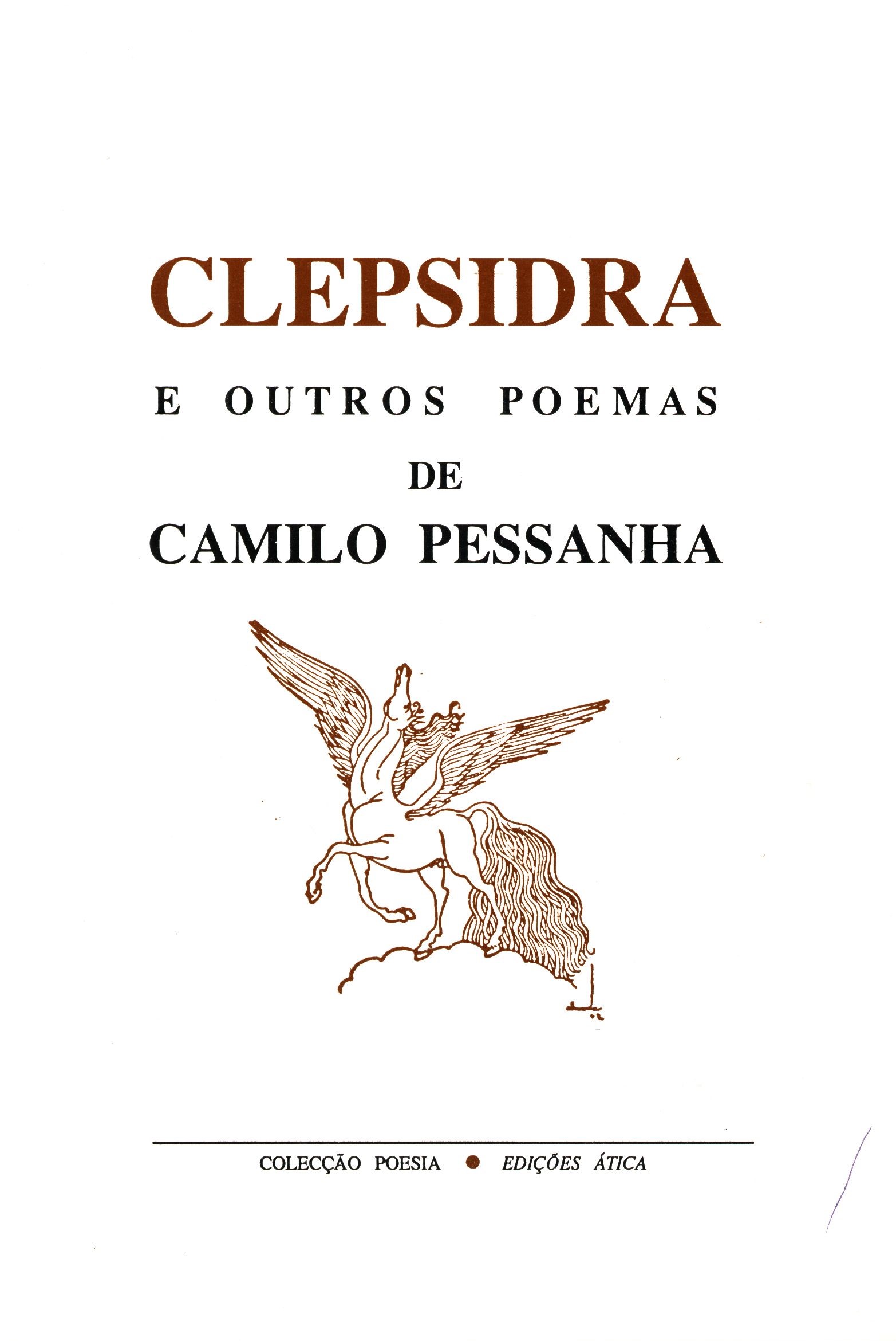 Názvové údaje Clepsidra e outros poemas / de Camilo Pessanha Osobní jméno Pessanha, Camilo, 1867-1926 (Autor) Údaje o vydání 7. edição Nakladatel Lisboa : Edições Ática, 1992 Výrobce Garamond-Artes Gráficas Rozsah 211 stran : fotografie ; 20 cm ISBN 972-617-014-1 (brožováno) Edice Colecção Poesia