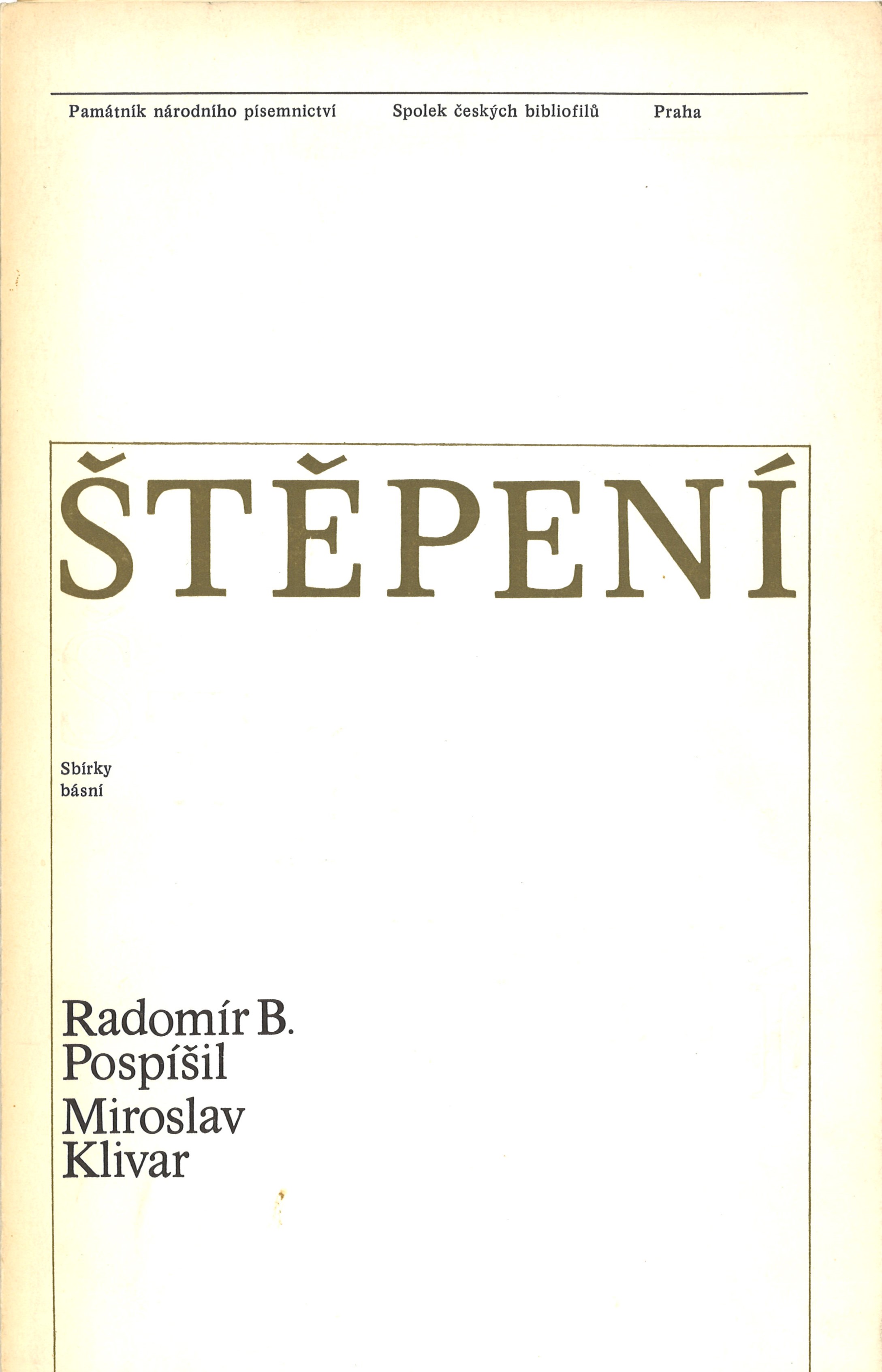 Názvové údaje Štěpení : sbírky básní Radomír B. Pospíšil ; Miroslav Klivar ; ilustrace Jaroslava Pospíšilová-Linhartová ; předmluvu napsal Karel Cvejn Další autoři Klivar, Miroslav, 1932-2014 (Autor) Pospíšilová, Jaroslava, 1942-2003 (Ilustrátor) Cvejn, Karel, 1911-1986 (Autor úvodu atd.) Korp. Památník národního písemnictví (muzeum literatury) (Nakladatel, vydavatel) Spolek českých bibliofilů v Praze (Nakladatel, vydavatel) Střední průmyslová škola grafická (Praha, Česko) (Tiskař) Nakladatel Praha : Památník národního písemnictví : Spolek českých bibliofilů, 1984 Výrobce Vytiskl Jaromír Novák ve Střední průmyslové škole grafické v Praze Rozsah 22, 22 stran (2 svazky) ; 30 cm ISBN (Brožováno) Země vyd. Česko Jazyk dok. čeština Poznámky Obálka zdobená plastickým tiskem. - Bibliofilie. - 2 svazky vložené ve společné obálce. - Každý svazek zdoben frontispisem s podpisem J. Pospíšilové-Linhartové. - Na záložce obálky podrobná anotace. - Na zadní záložce společná tiráž. - Každý svazek má svůj titulní list i svou tiráž. - Tištěno na nerozřezaných dvoulistech.