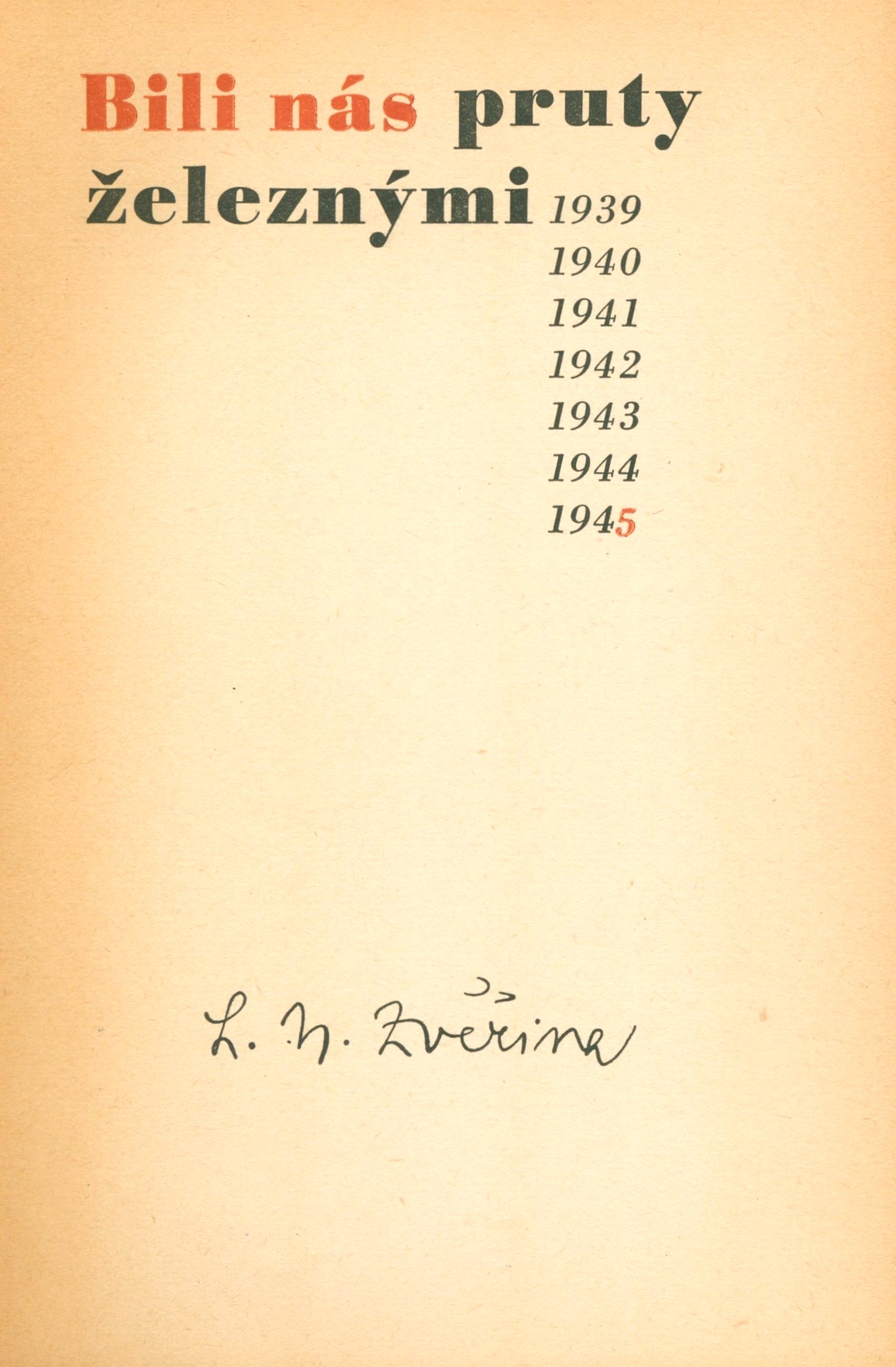 1. Názvové údajeBili nás pruty železnými : 1939, 1940, 1941, 1942, 1943, 1944, 1945 / L.N. Zvěřina ; obálku navrhl František Tröster ; grafickou úpravu provedl Oldřich Hlavsa