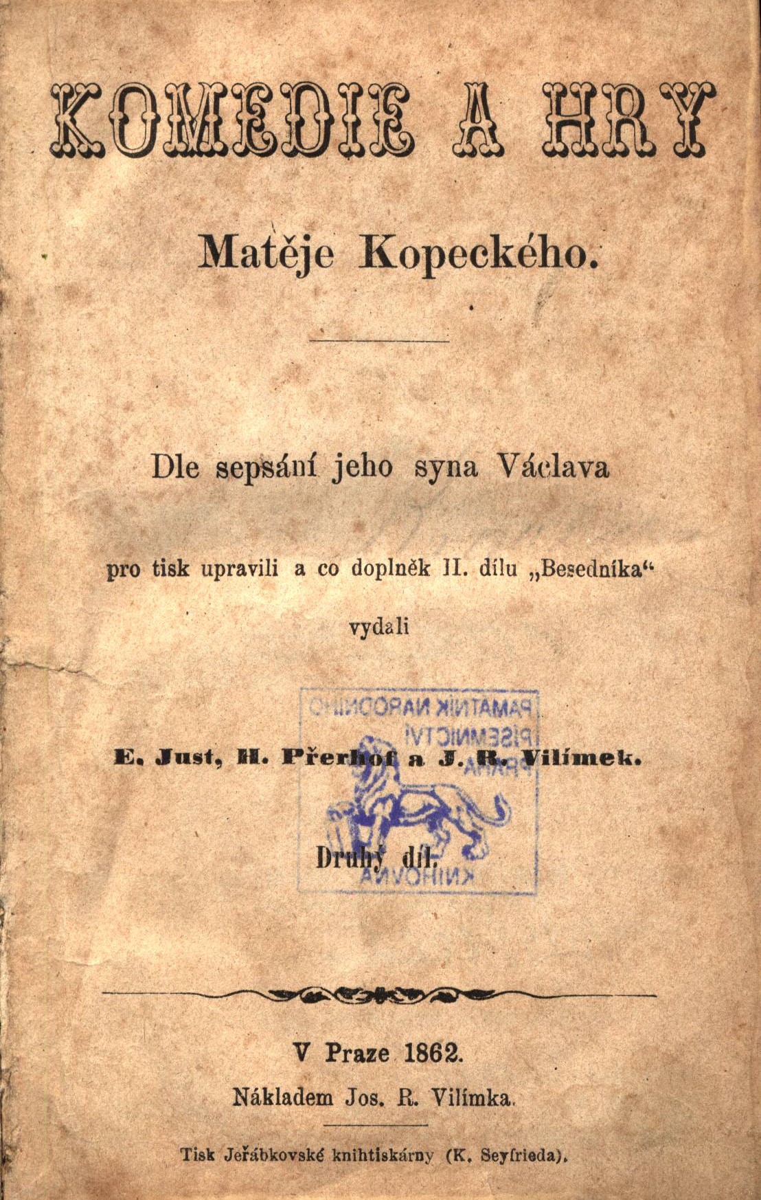 Názvové údaje Komedie a hry Matěje Kopeckého. Druhý díl / dle sepsání jeho syna Václava pro tisk upravili a co doplněk II. dílu "Besedníka" vydali K. Just, H. Přerhof a J.R. Vilímek Osobní jméno Kopecký, Václav, 1801-1871 (Autor) Další autoři Přerhof, Heřman, 1831-1867 (Editor) Vilímek, Josef Richard, 1835-1911 (Editor) Just, Eduard, 1836-1879 (Editor) Korp. Jos. R. Vilímek (nakladatelství) (Nakladatel, vydavatel) Jeřábkovská knihtiskárna. (K. Seyfried) (Tiskař) Nakladatel V Praze : nákladem Jos. R. Vilímka, 1862 Výrobce Tisk Jeřábkovské knihtiskárny (K. Seyfrieda) Rozsah 572 stran ; 16,5 cm ISBN (Vázáno) Země vyd. Česko Jazyk dok. čeština Citace Doucha 106. Ottův sl. nauč. XIV. 767 (o aut.) Druh dok. monografie Klíčová slova česká literatura * dramata * divadelní hry * komedie * loutkové divadlo MDT 821.162.3-2 * (0:82-2) * (0:82-22) * 792.97 Uživatelské pole PNP Sign. L XII d 38: Poněkud opotřebovaný výtisk v dobové poloplátěné vazbě. Sign. L XII d 38 - Retrokatalog Sign. VMartínek 1599: Knihovna Vojtěcha Martínka. - Razítko na titulním listu: Žákovská knihovna českého gymnasia v Mor. Ostravě. - Na přídeští razítko: Josef Střelec knihař, Pol. Ostrava, Zámostí 149. - Převazba. - Poškozený výtisk s odtrženým hřbetem. - Hnědé skvrny na listech. - Opravované některé stránky. - Poškozené desky. Sign. C12a 6365: 16 cm. - Poloplátěná dobová převazba s mramorovaným papírem. - Místy drobné hnědé skvrny na listech, jinak v dobrém stavu. Signatura Přír.číslo Lokace Info C12a 6365 1024/2025 Sbírka