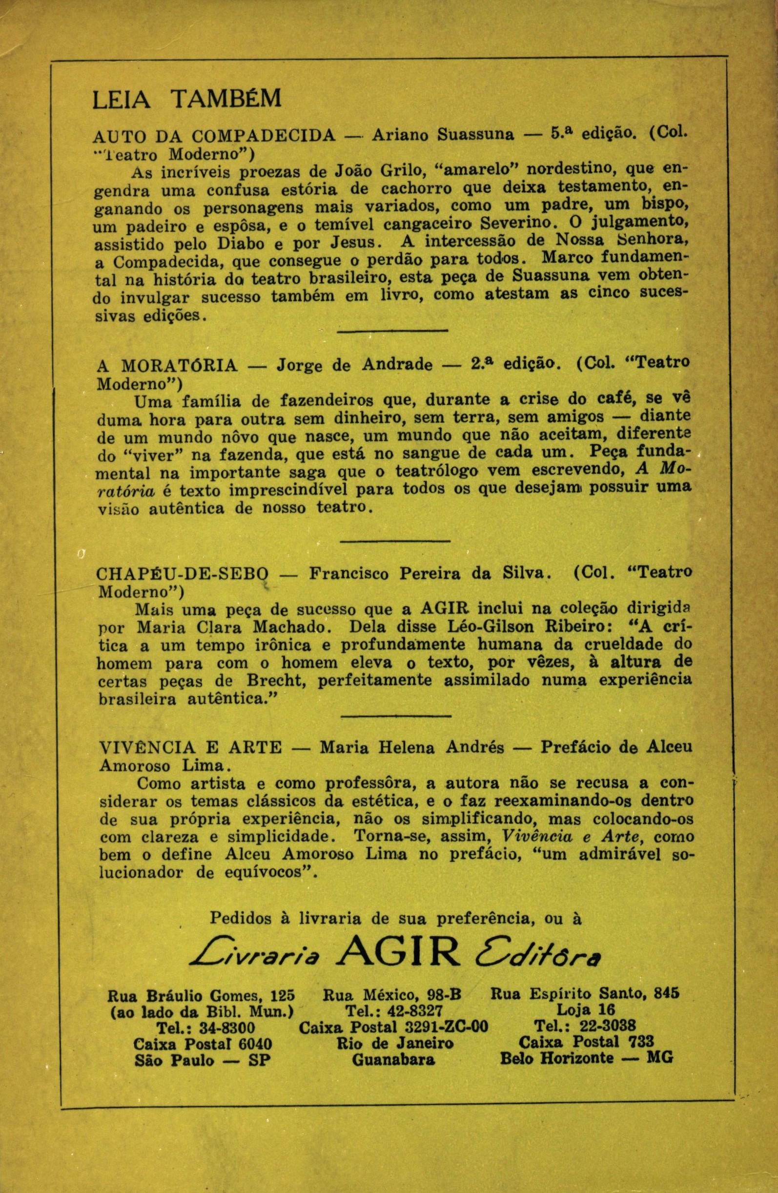 Názvové údaje A Menina e o Vento, Maroquinhas Fru-Fru, Maria Minhoca, A Gata Borralheira / Maria Clara Machado ; Capa de José Rios Osobní jméno Machado, Maria Clara, 1921-2001 (Autor) Další autoři Rios, José (Autor obálky) Korp. Agir (firma) (Nakladatel, vydavatel) Borsoi s / a. Indústria e comércio (Tiskař) Údaje o vydání 2.a edição Nakladatel Rio de Janeiro : Livraria Agir Editôra, 1969 Rozsah 170 stran : čb. fotografie ; 22 cm ISBN (Vázáno) Země vyd. Brazílie Jazyk dok. portugalština Poznámky Ilustrovaná obálka. - Typografický titulní list. - Obsah. - Čb. fotografie. - Na přední a zadní záložce zhodnocení autorčiny tvorby Yanem Michalskim. - Na zadní straně obálky soupis některých dalších knih vydaných ve stejném vydavatelství jako autorčina kniha.