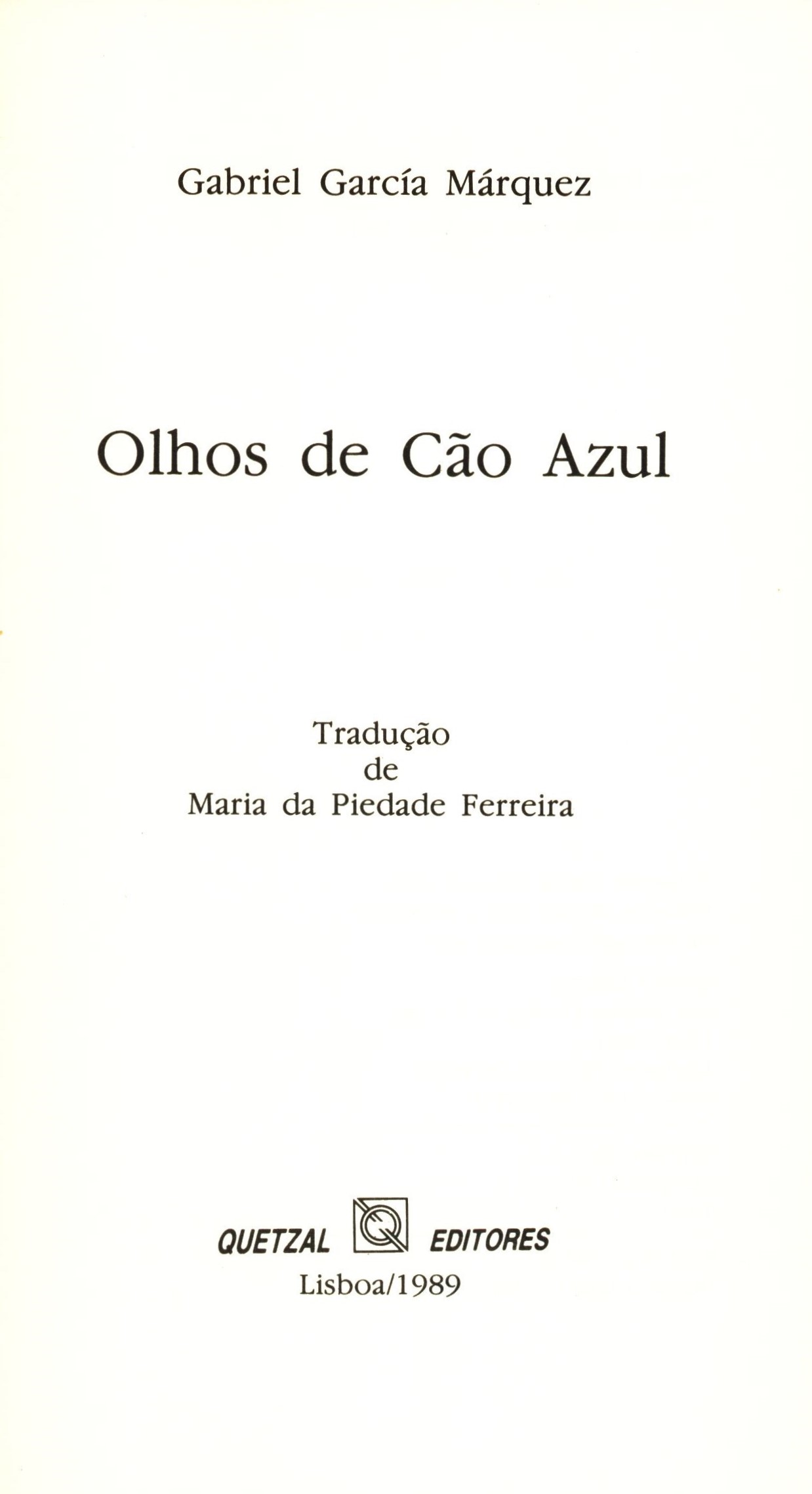 Názvové údaje Olhos de Cão Azul / Gabriel García Márquez; tradução de Maria da Piedade Ferreira Osobní jméno García Márquez, Gabriel, 1927-2014 (Autor) Další autoři da Piedade Ferreira, Maria (Překladatel) Korp. Quetzal Editores (Nakladatel, vydavatel) Tipografia Guerra (Tiskař) Nakladatel Lisabon : Quetzal Editores, 1989 Výrobce Viseu : Tipografia Guerra 1989 Rozsah 157 stran ; 20 cm ISBN (Brožováno) Edice Graffiti Země vyd. Portugalsko Jazyk dok. portugalština Poznámky Barevná ilustrovaná obálka se záložkami. - Na přední záložce informace o autorovi a jeho tvorbě. - Typografický titulní list. - Tiráž. - Obsah. Na zadní záložce seznam svazků vydaných ve stejné edici jako kniha autora. - Na zadní straně obálky úryvek z knihy autora.