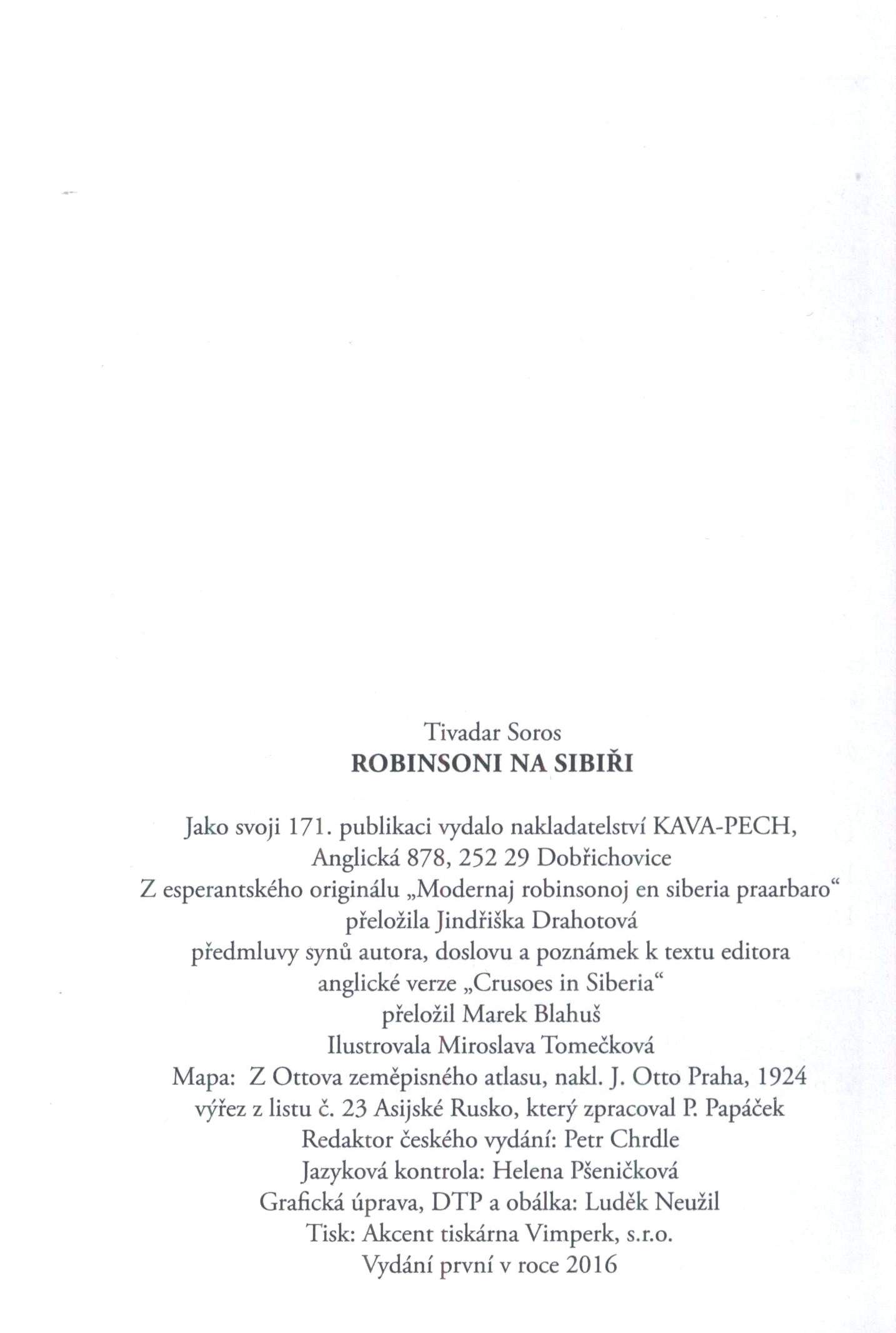 Názvové údaje Robinsoni na Sibiři a Nejspravedlivější soud / Tivadar Soros ; z esperantského originálu "Modernaj robinsonoj en siberia praarbaro" přeložila Jindřiška Drahotová ; předmluvy synů autora, doslovu a poznámek k textu editora anglické verze "Crusoes in Siberia" přeložil Marek Blahuš ; ilustrovala Miroslava Tomečková ; grafická úprava, DTP a obálka Luděk Neužil Osobní jméno Soros, Tivadar, 1893-1968 (Autor) Další autoři Drahotová, Jindřiška, 1938- (Překladatel) Blahuš, Marek, 1986- (Překladatel) Neužil, Luděk, 1955- (Knižní grafik) (Typograf) (Autor obálky) Korp. KAVA-PECH (nakladatelství) (Nakladatel, vydavatel) Akcent tiskárna Vimperk (Tiskař) Údaje o vydání Vydání první Nakladatel Dobřichovice : KAVA-PECH, 2016 Výrobce Akcent tiskárna Vimperk, s.r.o. Rozsah 102 stran, 1 nečíslovaný složený list obrazové přílohy : ilustrace (některé barevné), 1 mapa ; 22 cm ISBN 978-80-87169-60-5 (vázáno) Země vyd. Česko Jazyk dok. čeština Jazyk orig. esperanto * angličtina Poznámky Zdobená barevná obálka. - Světle žlutá vazba s černým textem na hřbetě. - Na přední záložce obálky úryvek z předmluvy G. Sorose, na zadní záložce biografická poznámka o G. Sorosovi s barevným fotem a vzpomínka C. Höschla na G. Sorose s barevným fotem. - Předmluva G. Sorose. - Předmluva P. Sorose. - Úvod. - Černobílé, převážně celostránkové ilustrace. - Dovětek. - Poznámky. - Doslov editora (H. Tonkin). - Složená barevná mapa s legendou. - Přílohy. - Nejspravedlivější soud. - Nakladatelská inzerce. - Obsah. - Na zadní straně obálky poznámka o autorovi s fotem, editorovi a překladatelce.