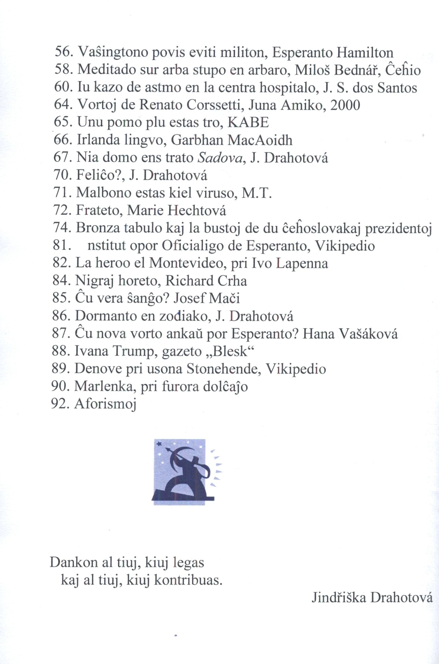 Názvové údaje Legaĵoj XI. / kolektis Jindřiška Drahotová Další autoři Drahotová, Jindřiška, 1938- (Sestavovatel, kompilátor) (Nakladatel, vydavatel) Korp. Tiskárna Čistá (Tiskař) Nakladatel [Mladá Boleslav] : [Jindřiška Drahotová], 2022 Výrobce [Čistá] : Tiskárna Čistá Rozsah 93 stran : ilustrace (převážně barevné), portréty ISBN (Brožováno) Země vyd. Česko Jazyk dok. esperanto Poznámky Bílozelená obálka. - Titulní list zdobený barevnou ilustrací. - Převážně barevné ilustrace, fotografie a portréty. - Obsah.