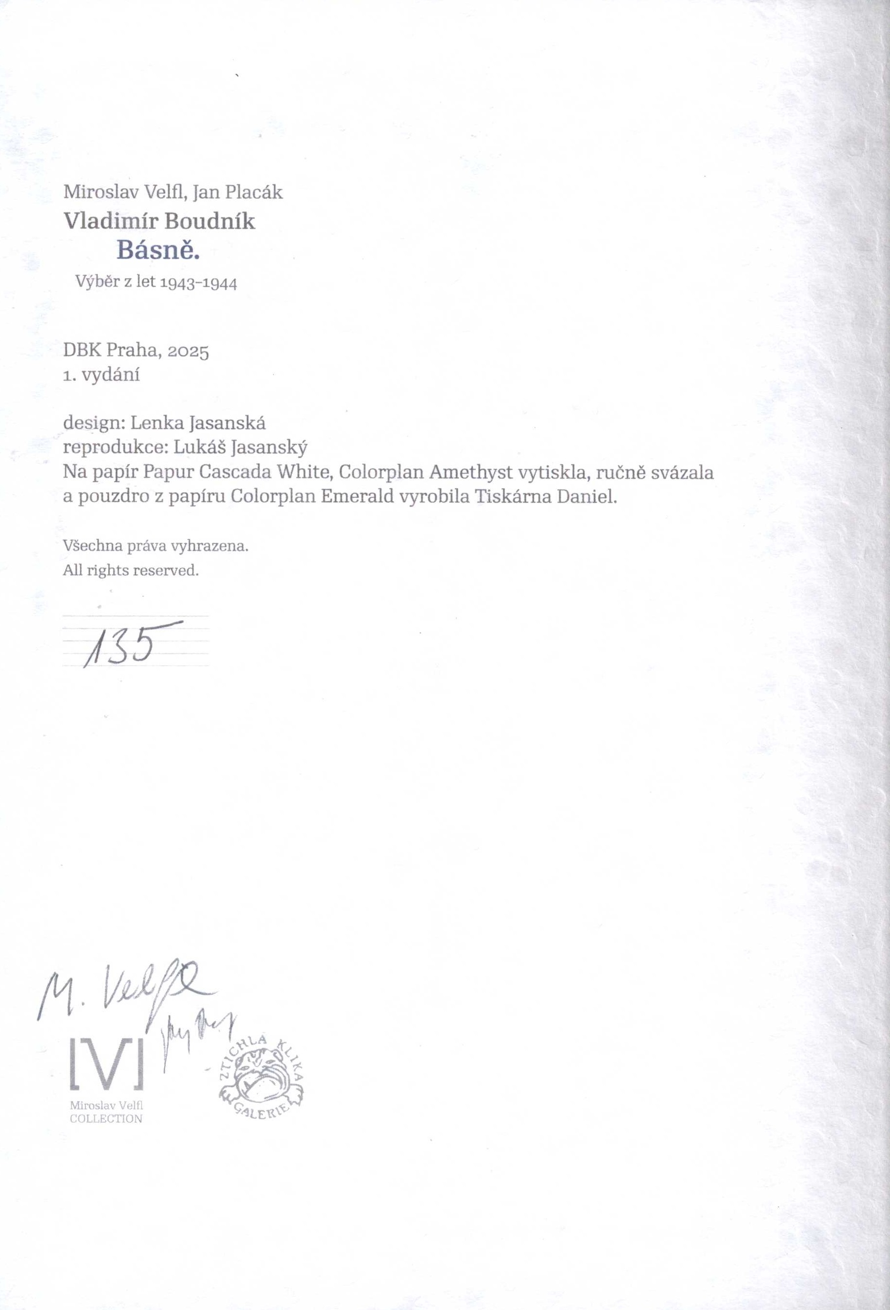 Uživatelské pole PNPSign. LITb 2960/2: V tiráži vepsáno tužkou číslo výtisku 135 a podpisy Miroslava Velfla a Jana Placáka