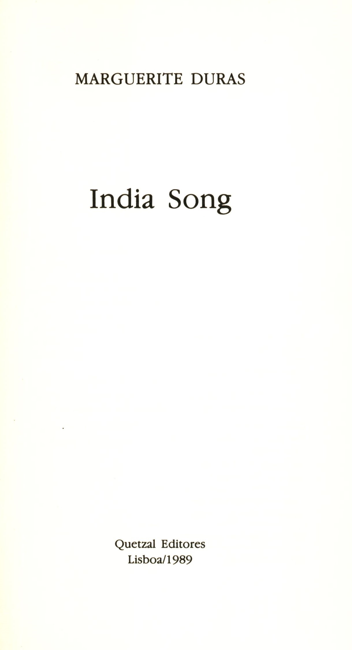Názvové údaje India Song / Marguerite Duras Osobní jméno Duras, Marguerite, 1914-1996 (Autor) Další autoři Quetzal Editores (Nakladatel, vydavatel) Tipografia Guerra (Tiskař) Nakladatel Lisabon : Quetzal Editores, 1989 Výrobce Viseu : Tipografia Guerra Rozsah 142 stran ; 20 cm ISBN (Brožováno) Země vyd. Portugalsko Jazyk dok. portugalština Poznámky Zdobená obálka. - Typografický titulní list. - Resumé.