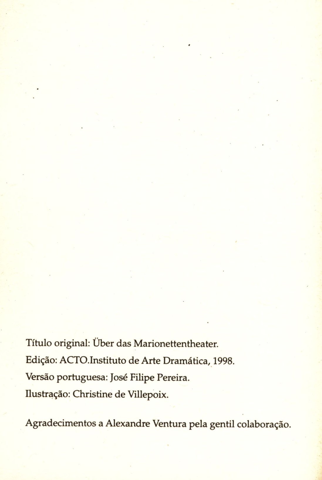 Názvové údaje Sobre o teatro de marionetas / Heinrich von Kleist Osobní jméno Kleist, Heinrich von, 1777-1811 (Autor) Další autoři ACTO. Instituto de Arte Dramática (Nakladatel, vydavatel) Minerva Central (Tiskař) Nakladatel [Aveiro] : ACTO. Instituto de Arte Dramática, 1998 Výrobce Minerva Central Rozsah 22 stran : čb. ilustrace ; 15 cm ISBN (Brožováno) Země vyd. Portugalsko Jazyk dok. portugalština Jazyk orig. němčina Poznámky Typografická obálka. - Čb. ilustrace. - Poznámky pod čarou. - Stručná autorova biografie