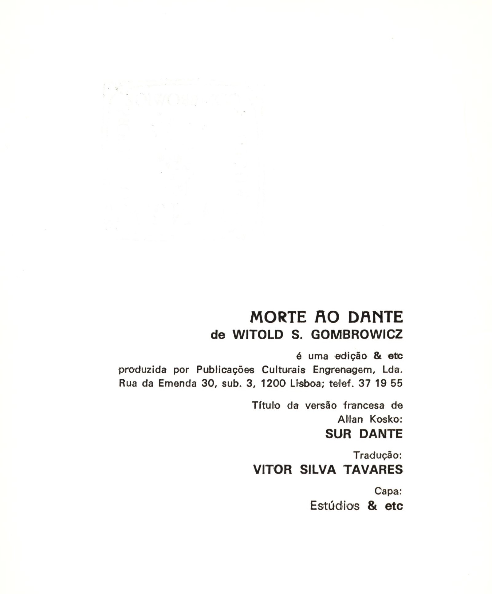 Názvové údaje Morte ao Dante / Witold S. Gombrowicz Osobní jméno Gombrowicz, Witold, 1904-1969 (Autor) Další autoři & etc (Nakladatel, vydavatel) Minigráfica - Cooperativa de Artes Gráficas, CRL (Tiskař) Nakladatel Lisboa : & etc, [1987] Výrobce Minigráfica - Cooperativa de Artes Gráficas, CRL Rozsah 77 stran : čb. ilustrace ; 18 cm ISBN (Brožováno) Země vyd. Portugalsko Jazyk dok. portugalština Poznámky Zdobená obálka. - Čb. ilustrace. - Titulní list s ilustrací. - Biografie autora. - Rozhovor s autorem