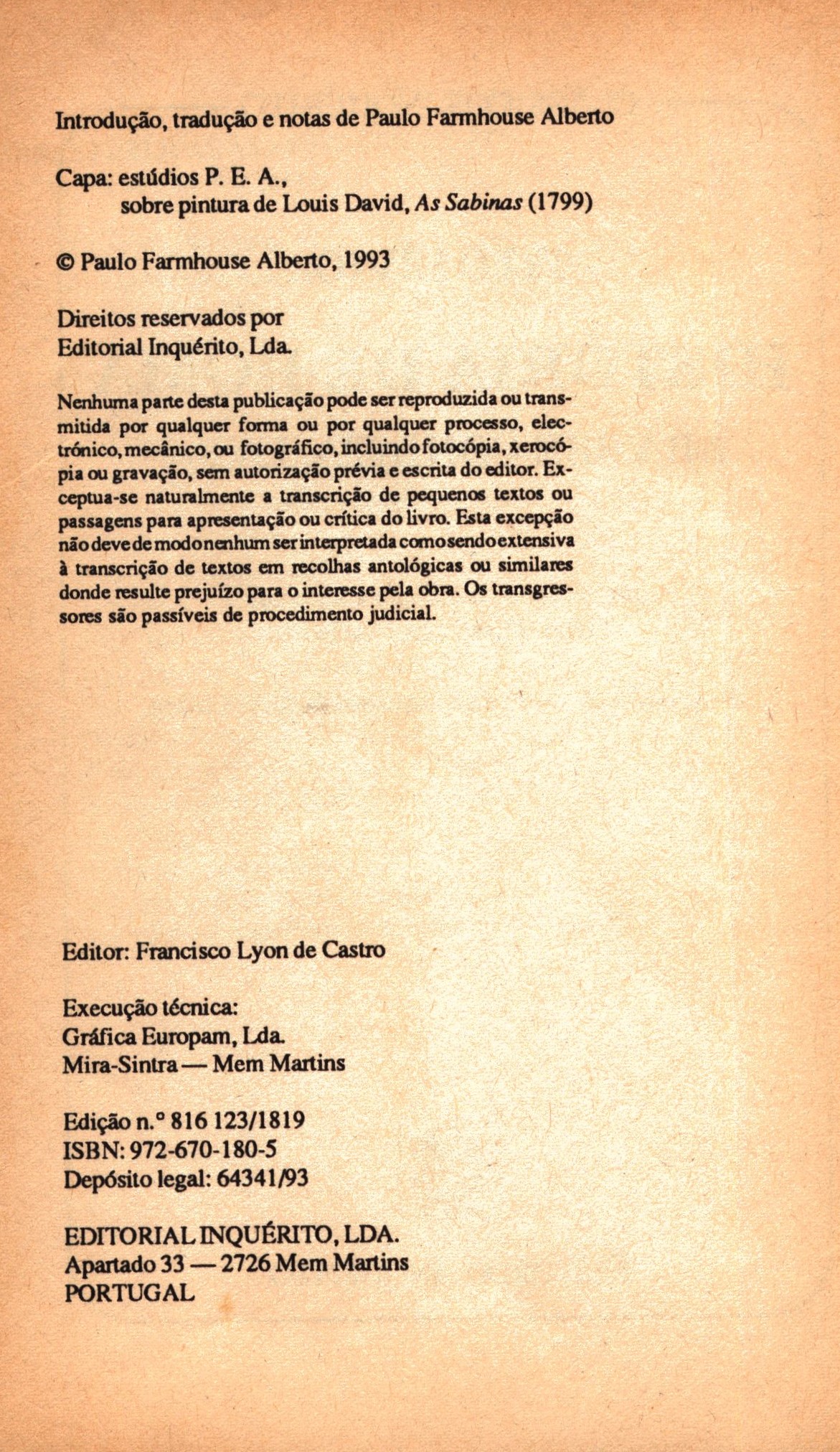 Clássicos Inquérito (Inquérito)Země vyd. Portugalsko Jazyk dok. portugalština Jazyk orig. latina Poznámky Zdobená obálka. - Úvod. - Poznámky pod čarou. - Čb. ilustrace