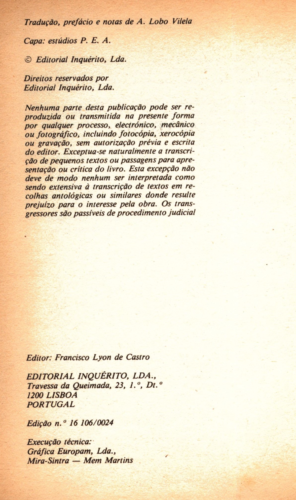 1. Názvové údajeAs vespas / Aristófanes ; tradução, prefácio e notas de A. Lobo Vilela ; capa: estúdios P. E. A. ; editor: Francisco Lyon de Castro