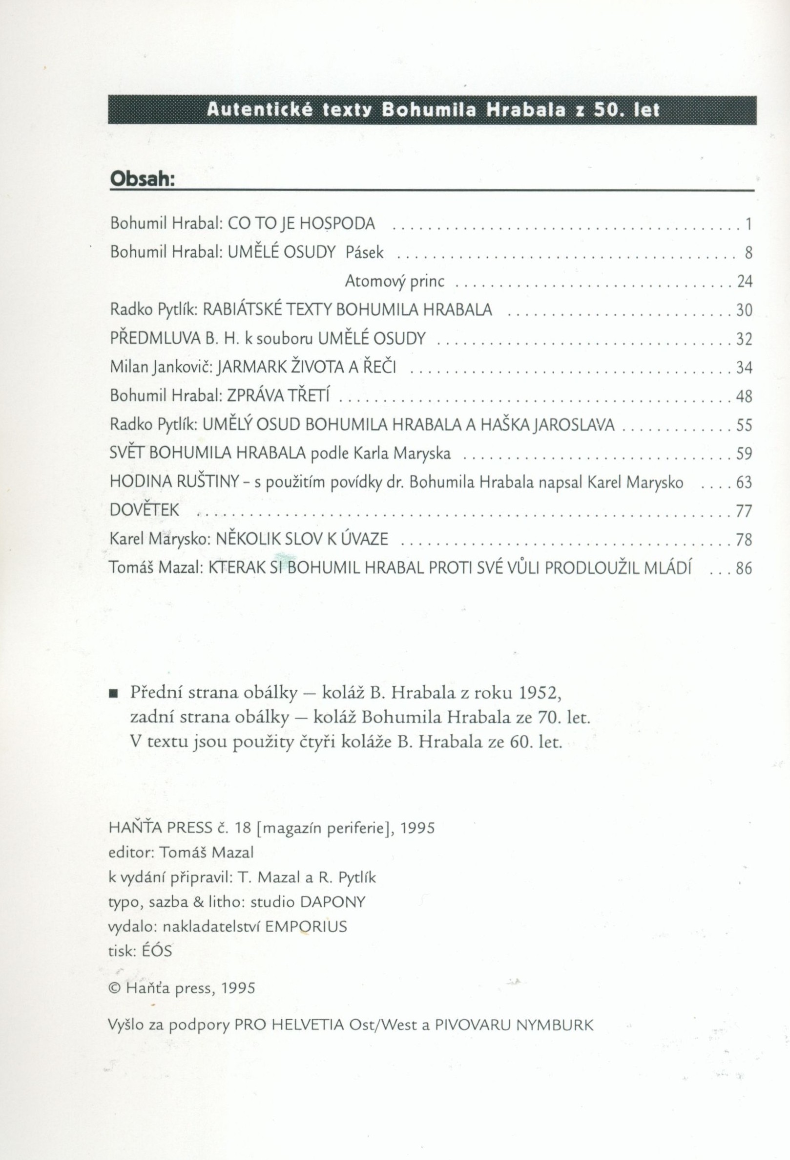 Názvové údaje Haňťa Press. Číslo 18, magazín periferie / editor Tomáš Mazal ; k vydání připravil: Tomáš Mazal a Radko Pytlík Další autoři Mazal, Tomáš, 1956- (Editor) (Autor) Pytlík, Radko, 1928-2022 (Editor) (Autor) Hrabal, Bohumil, 1914-1997 (Umělec) Korp. Emporius (nakladatelství) (Nakladatel, vydavatel) Éós (tiskárna) (Tiskař) Nakladatel Praha : EMPORIUS, 1995 Výrobce Praha : ÉÓS Rozsah 88 stran : ilustrace, fotografie, faksimile ; 20,5 cm ISBN (Brožováno) Země vyd. Česko Jazyk dok. čeština Poznámky Časopis. - Černobílá koláž (B. Hrabal), faksimile ručně psaného textu B. Hrabala a černobílé ilustrace na obálce. - Na rubu obálky obsah a tiráž. - Jednotlivé příspěvky. - Černobílé fotografie s popisky v textu. - Černobílé koláže (B. Hrabal), pivní viněta, faksimile dokumentů. - Na zadní straně obálky barevná koláž B. Hrabala ze 70. let.