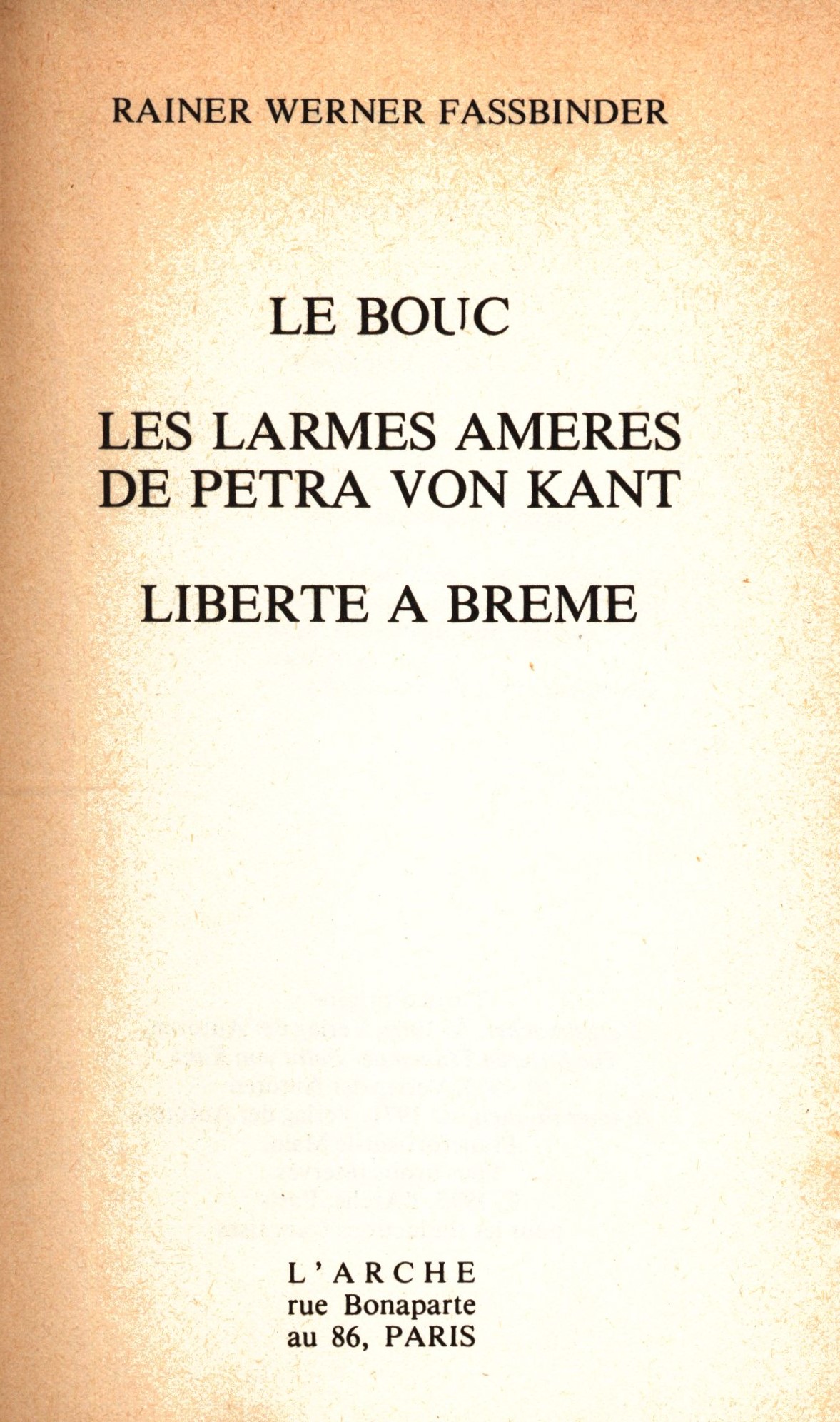 Title information Le bouc, Les larmes ameres de Petra von Kant, Liberte a Breme / Rainer Werner Fasbinder Personal name Werner Fasbinder, Rainer (Author) Další autoři L'Arche (Publisher) L'Imprimerie Corlet (Printer) Publication Paris : L'Arche, [1977] Manufacture Condé-sur-Noireau : L'Imprimerie Corlet Scope 127 stran ; 18 cm ISBN (Brožováno) Country France Language French Note Barevná typografická obálka. - Informace o autorovi