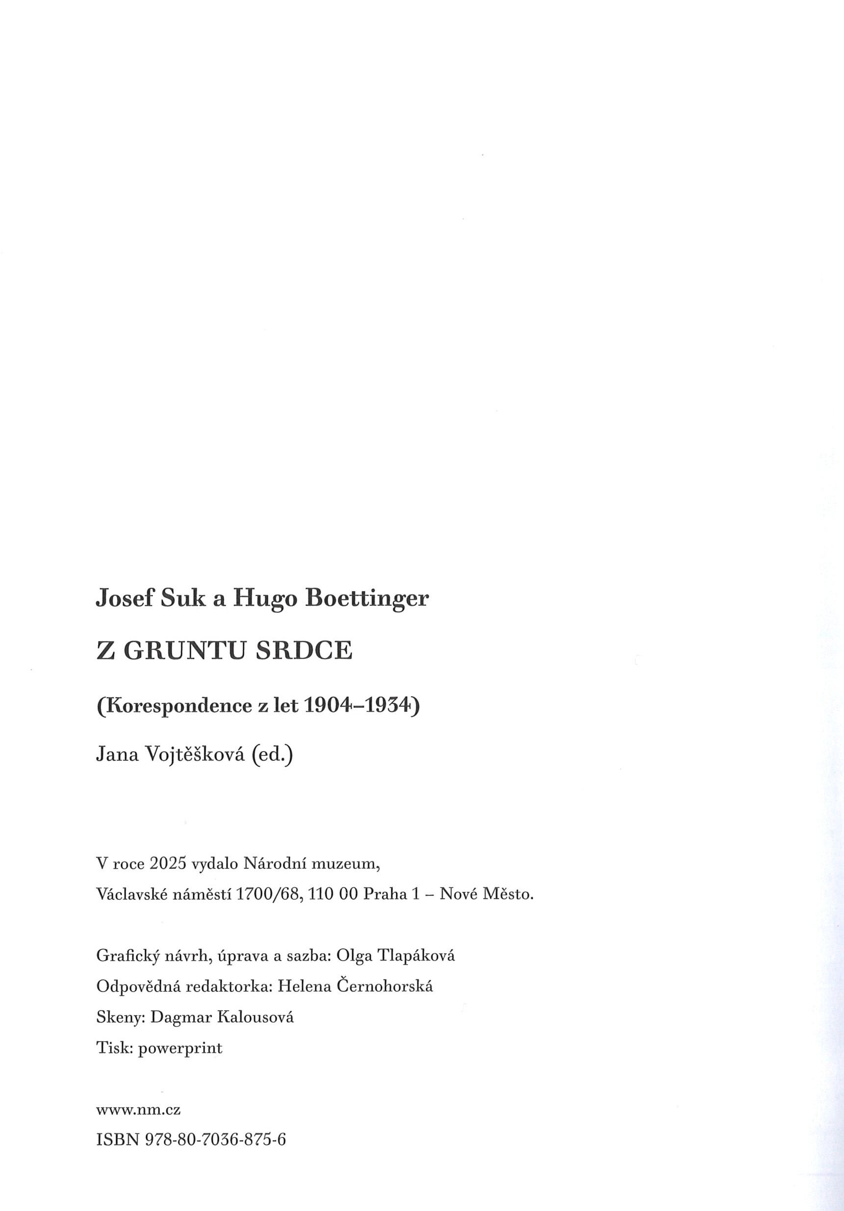 Názvové údaje Z gruntu srdce : (korespondence z let 1904-1934) / Josef Suk a Hugo Boettinger ; Jana Vojtěšková (ed.) ; grafický návrh, úprava a sazba: Olga Tlapáková Osobní jméno Suk, Josef, 1874-1935 (Korespondent) (Adresát, příjemce) Další autoři Boettinger, Hugo, 1880-1934 (Korespondent) (Adresát, příjemce) Vojtěšková, Jana, 1958- (Editor) Tlapáková, Olga, 1978- (Typograf) (Sazeč) Korp. Národní muzeum (Praha, Česko) (Nakladatel, vydavatel) Powerprint (firma) (Tiskař) Další var.názvy Josef Suk a Hugo Boettinger z gruntu srdce Nakladatel Praha : Národní muzeum, 2025 Výrobce Powerprint Rozsah 295 stran : ilustrace (převážně barevné), portréty, faksimile ; 23 cm ISBN 978-80-7036-875-6 (vázáno) Země vyd. Česko Jazyk dok. čeština Poznámky Celoplátěná vazba s tiskem. - Bez přebalu. - Kresbou zdobené předsádky. - Úvod. - Biografie. - Černobílé, barevné a tónované reprodukce, zejména kresby. - Faksimile dopisů. - Poznámky. - Seznam vyobrazení. - Jmenný rejstřík
