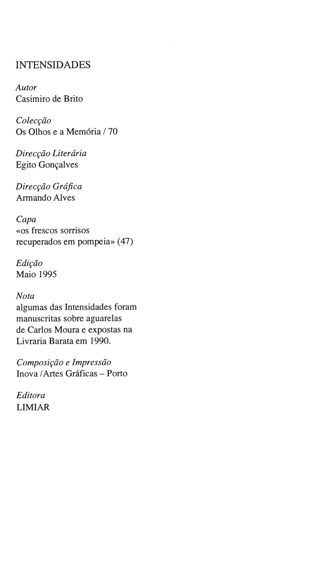 Názvové údaje Intensidades / Casimiro de Brito Osobní jméno Brito, Casimiro de, 1938-2024 (Autor) Další autoři Limiar (Nakladatel, vydavatel) Inova (firma) (Tiskař) Nakladatel [Porto] : Limiar, [1995] Výrobce Inova Rozsah 70 stran ; 21 cm ISBN (Brožováno) Edice Os olhos e a memória (Limiar) ; 70
