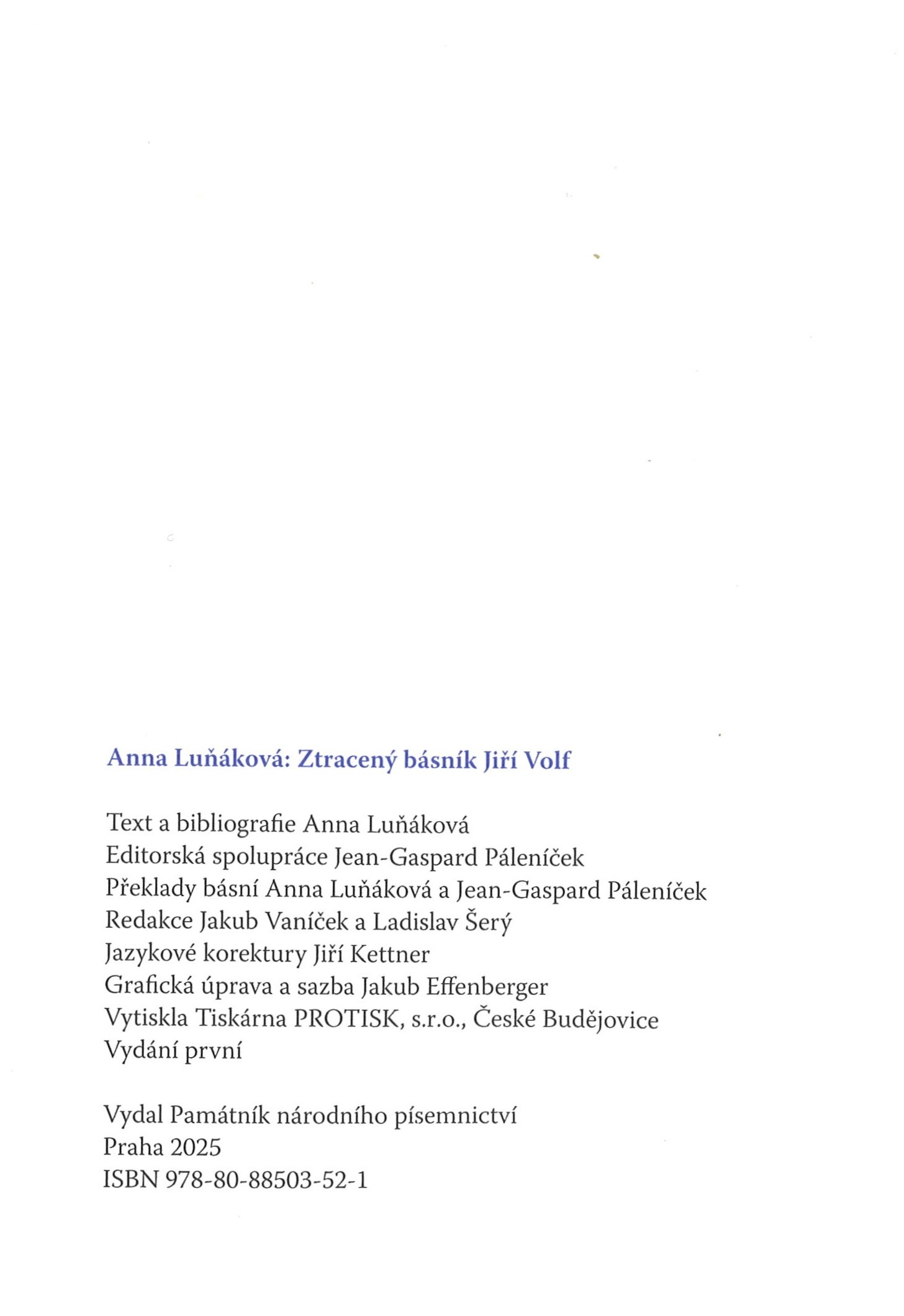 Názvové údaje Ztracený básník Jiří Volf / Anna Luňáková Osobní jméno Luňáková, Anna, 1993- (Autor) (Překladatel) Další autoři Páleníček, Jean-Gaspard, 1978- (Překladatel) (Editor) Effenberger, Jakub, 1964- (Knižní grafik) (Sazeč) Korp. Památník národního písemnictví / Muzeum literatury (Nakladatel, vydavatel) Protisk (tiskárna, České Budějovice) (Tiskař) Nakladatel Praha: Památník národního písemnictví, 2025 Výrobce České Budějovice : Tiskárna PROTISK, s.r.o. Rozsah 233 stran : ilustrace, portréty, faksimile ; 22 cm ISBN 978-80-88503-52-1 (vázáno) Země vyd. Česko Jazyk dok. čeština * francouzština Jazyk orig. francouzština Poznámky Zdobená kartonová vazba bez přebalu. - Frontispis. - Dvoubarevně tištěný titulní list. - Úvod. - Černobílé ilustrace, faksimile kreseb a rukopisů, fotografie. - Biografická část knihy tištěna na bílém papíře, část s překlady básní bílým písmem na černém pozadí. - Soupis díla. - Prameny. - Poznámky