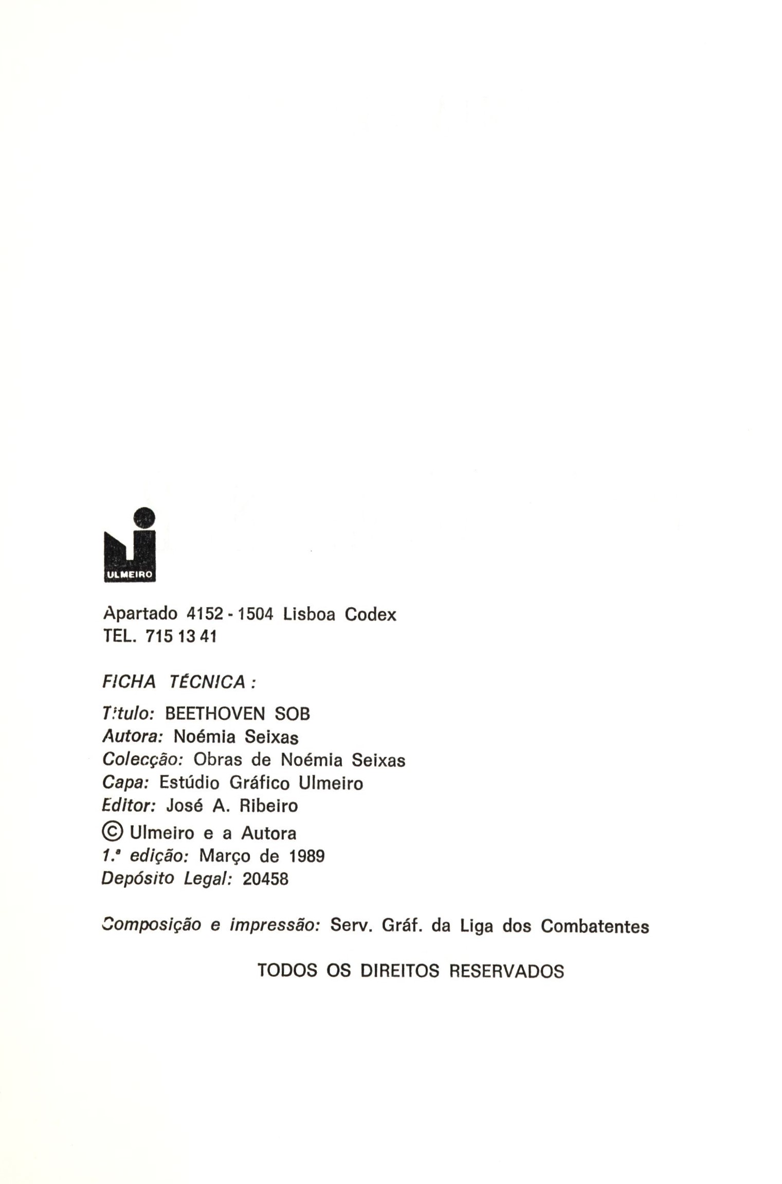 Názvové údaje Beethoven sob / Noémia Seixas Osobní jméno Seixas, Noémia, 1912 - 1992 (Autor) Další autoři Ulmeiro (Nakladatel, vydavatel) Serv. Gráf. da Liga dos Combatentes (Tiskař) Údaje o vydání 1.a edição Nakladatel [Lisboa] : Ulmeiro, [1989] Výrobce Serv. Gráf. da Liga dos Combatentes Rozsah 175 stran : čb. ilustrace ; 21 cm ISBN (Vázáno) Země vyd. Portugalsko Jazyk dok. portugalština Poznámky Zdobená obálka. - Čb. ilustrace na zadní straně obálky