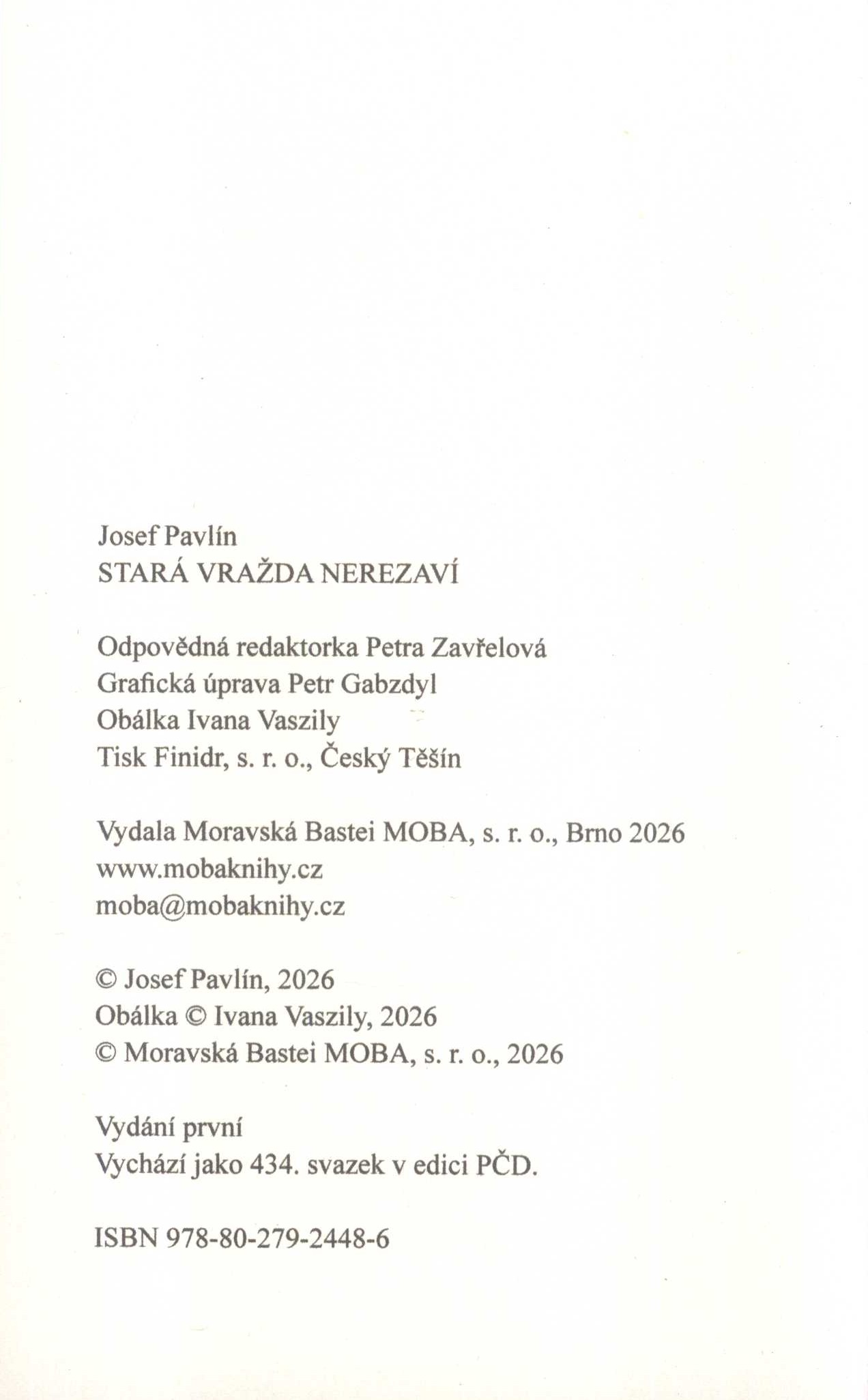 Title information Stará vražda nerezaví / Josef Pavlín ; grafická úprava Petr Gabzdyl ; obálka Ivana Vaszily Personal name Pavlín, Josef (Author) Další autoři Gabzdyl, Petr, 1978- (Book designer) Dudková, Ivana, 1990- (Bookjacket designer) Corporation Nakladatelství MOBA (Publisher) Finidr (tiskárna) (Printer) Edition statement Vydání první Publication Brno : MOBA, 2026 Manufacture Český Těšín : Finidr, s.r.o. Scope 279 stran ; 19 cm ISBN 978-80-279-2448-6 (vázáno) Edition Původní česká detektivka ; 434. svazek
