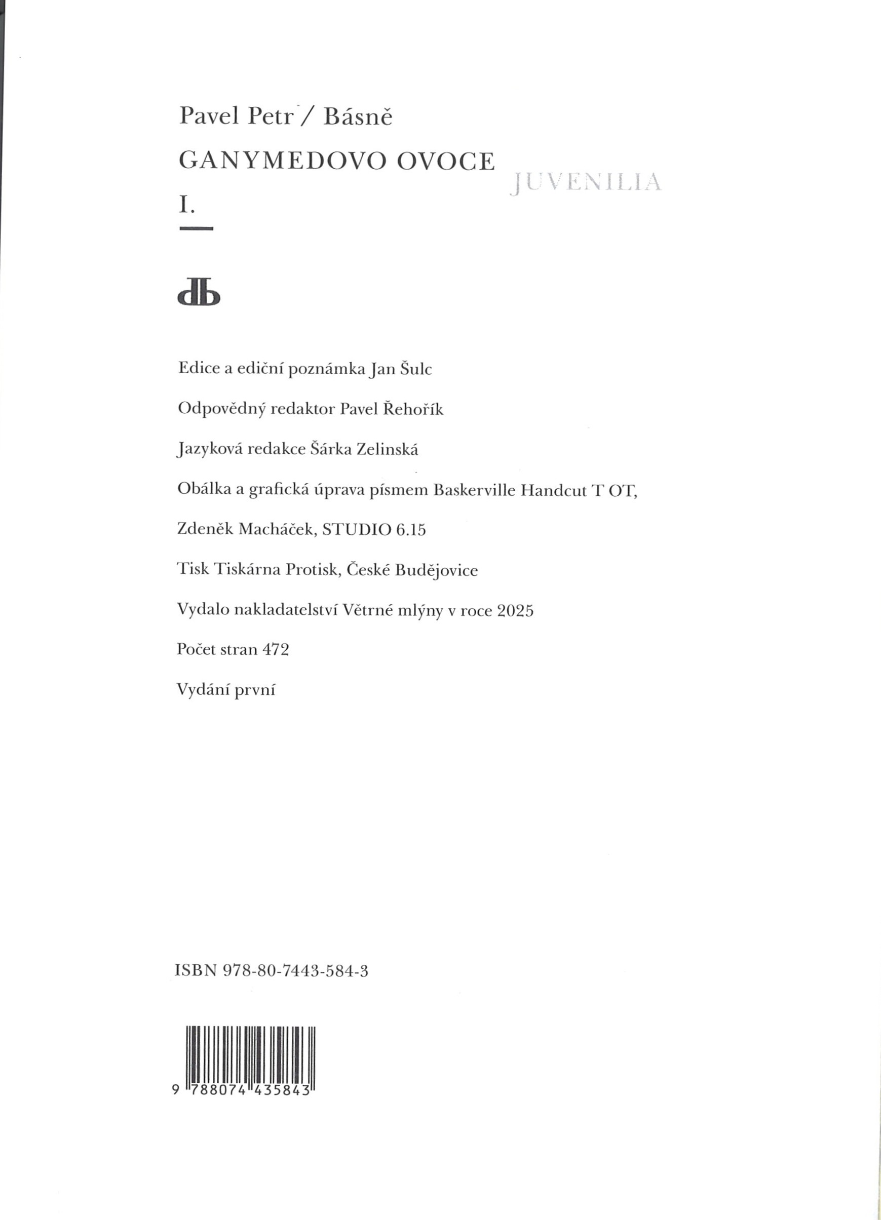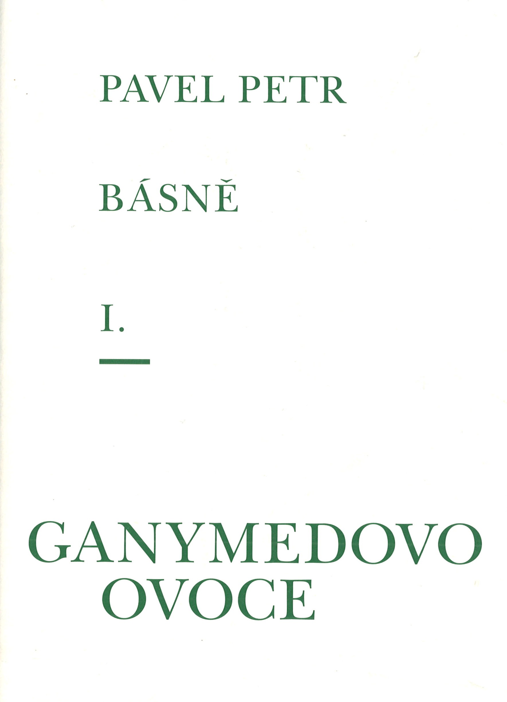 1. Názvové údajeBásně. I, Ganymedovo ovoce : juvenilia / Pavel Petr ; edice a ediční poznámka Jan Šulc ; obálka a grafická úprava ... Zdeněk Macháček
