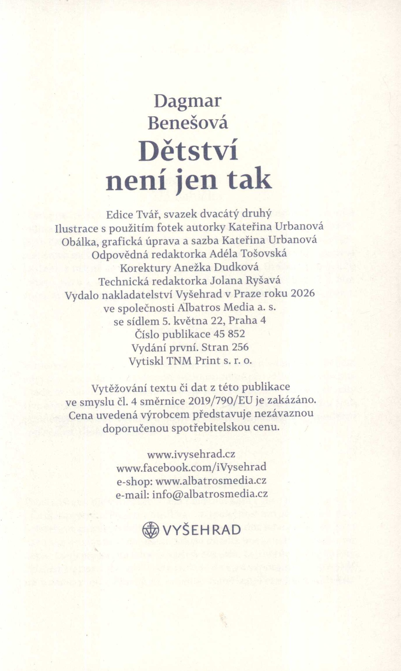 Názvové údaje Dětství není jen tak / Dagmar Benešová ; ilustrace s použitím fotek autorky, obálka, grafická úprava a sazba Kateřina Urbanová Osobní jméno Benešová, Dagmar, 1953- (Autor) (Fotograf) Další autoři Urbanová, Kateřina, 1995- (Ilustrátor) (Autor obálky) (Knižní grafik) (Sazeč) Korp. Vyšehrad (nakladatelství) (Nakladatel, vydavatel) TNM PRINT s. r. o. (tiskárna) (Tiskař) Údaje o vydání Vydání první Nakladatel V Praze : Vyšehrad, 2026 Výrobce TNM Print s.r.o. Rozsah 248 stran : barevné ilustrace ; 21 cm ISBN 978-80-267-3366-9 (vázáno) Edice Tvář ; svazek 22.