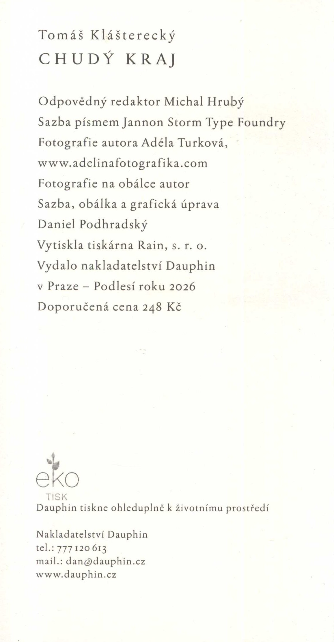 Názvové údaje Chudý kraj / Tomáš Klášterecký ; fotografie autora Adéla Turková ; fotografie na obálce autor ; sazba, obálka a grafická úprava Daniel Podhradský Osobní jméno Klášterecký, Tomáš, 1981- (Autor) (Fotograf) Další autoři Turková, Adéla, 1984- (Fotograf) Podhradský, Daniel, 1967- (Sazeč) (Autor obálky) (Knižní grafik) Korp. Nakladatelství Dauphin (Nakladatel, vydavatel) Rain (tiskárna) (Tiskař) Nakladatel V Praze ; Podlesí : Dauphin, 2026 Výrobce Rain, s.r.o. Rozsah 55 stran ; ISBN 978-80-7645-698-3 (brožováno) Edice Česká slova