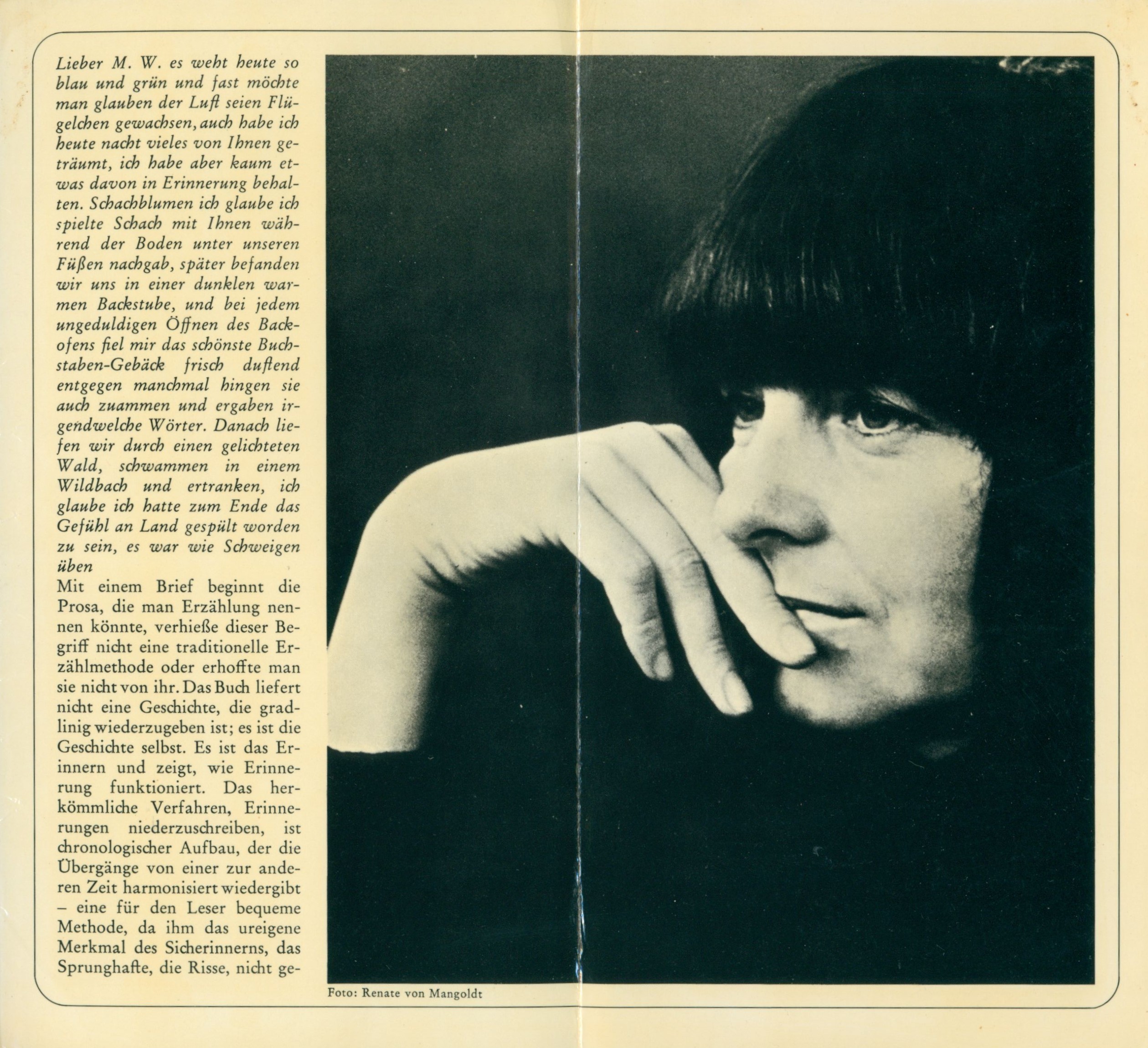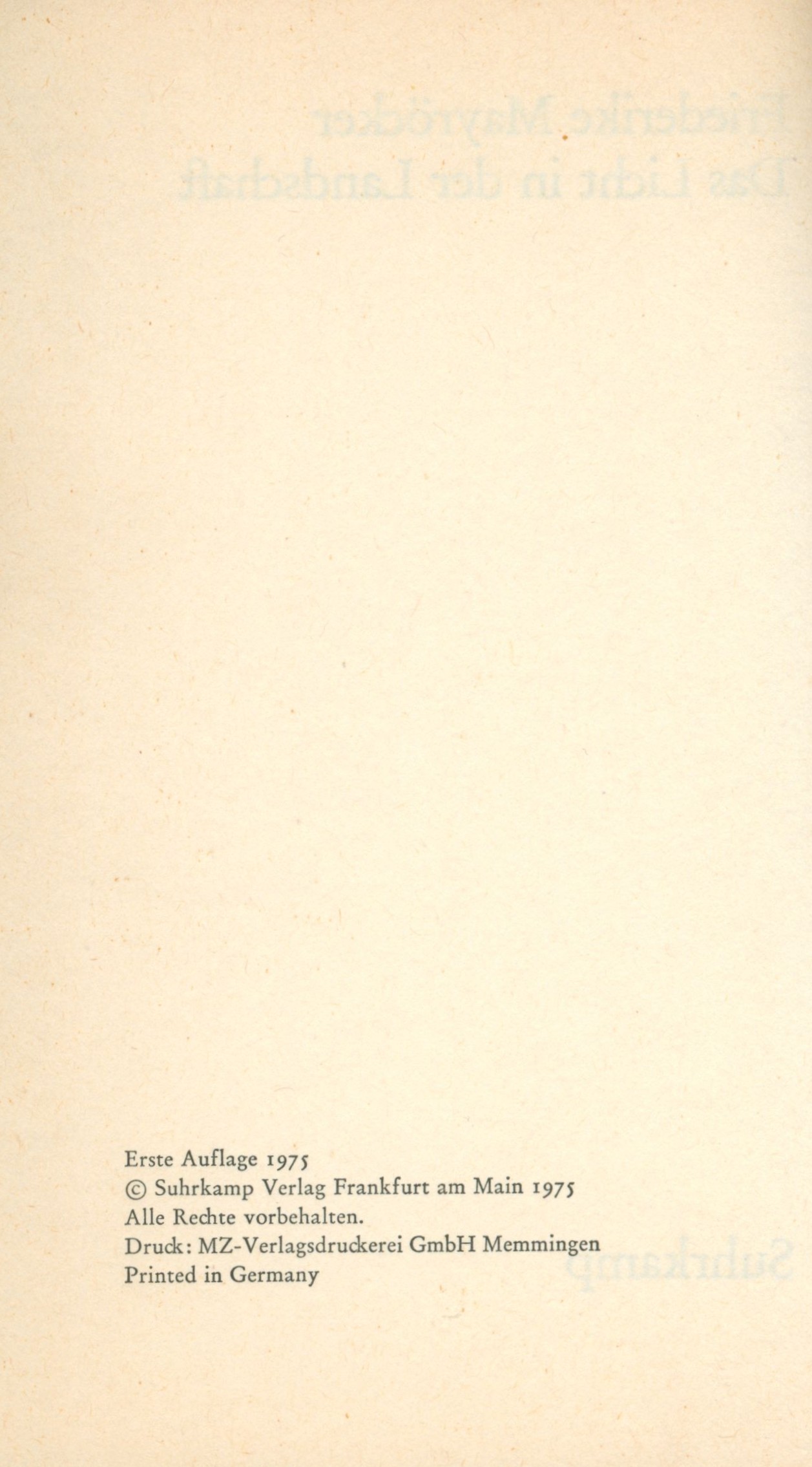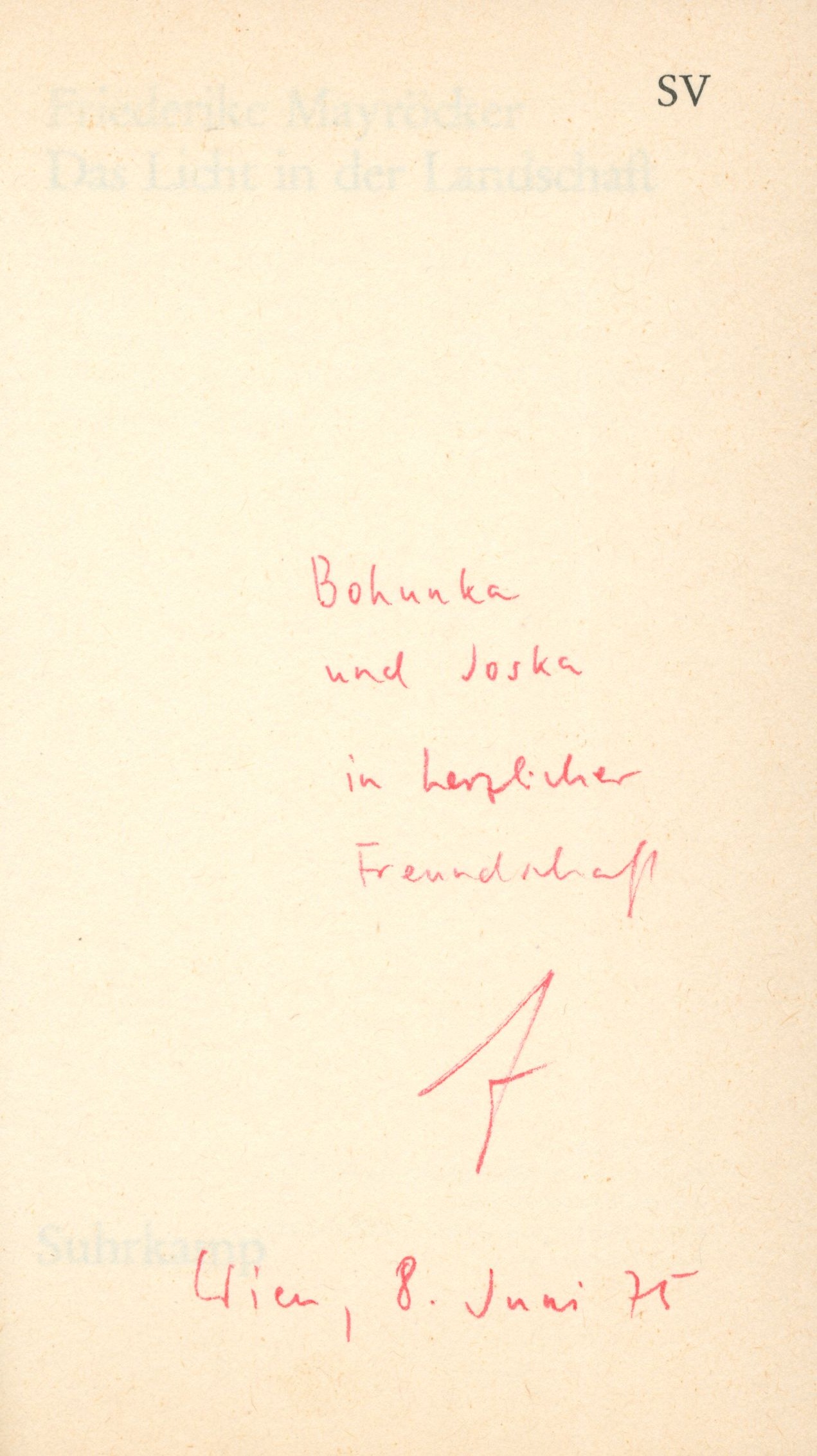 Názvové údaje Das Licht in der Landschaft / Friderike Mayröcker Osobní jméno Mayröcker, Friederike, 1924-2021 (Autor) (Dedikátor) Další autoři Mangoldt, Renate von, 1940- (Fotograf) Grögerová, Bohumila, 1921-2014 (Dedikant) Hiršal, Josef, 1920-2003 (Dedikant) Korp. Suhrkamp Verlag (nakladatelství) (Nakladatel, vydavatel) MZ-Verlagsdruckerei (tiskárna) (Tiskař) Údaje o vydání 1. Auflage Nakladatel Frankfurt am Main : Suhrkamp Verlag, 1975 Výrobce Memmingen : MZ-Verlagsdruckerei GmbH Rozsah 137 stran ; 20 cm ISBN 3-518-03626-2 (brožováno) Země vyd. Německo Jazyk dok. němčina Poznámky Bílá obálka s barevným portrétem autorky, dvoubarevný text (na hřbetu černý). - Složená přední záložka s černobílou fotografií autorky (R. von Mangoldt) a textem. - Texty (dopisy). - Poděkování.